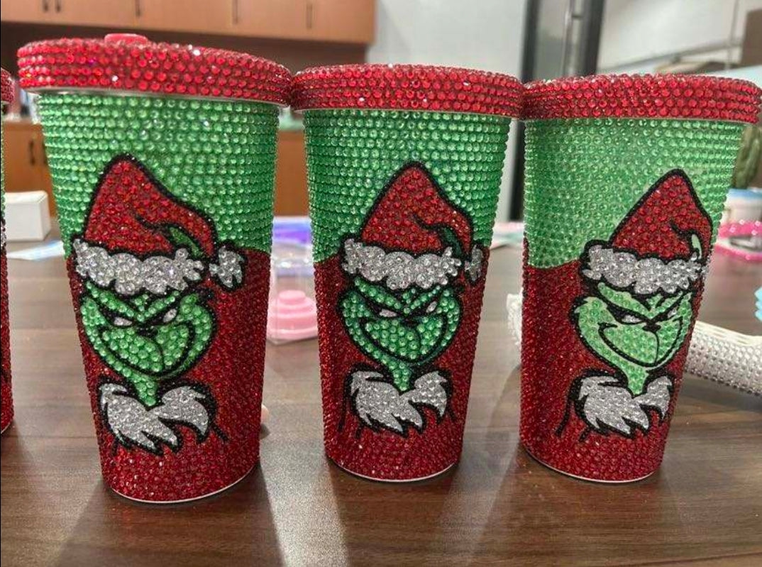 Jeweled Grinch cup 16.9 oz. with straw and straw cleaner