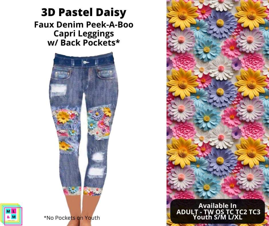 3D Pastel Daisy Faux Denim Peekaboo Capris