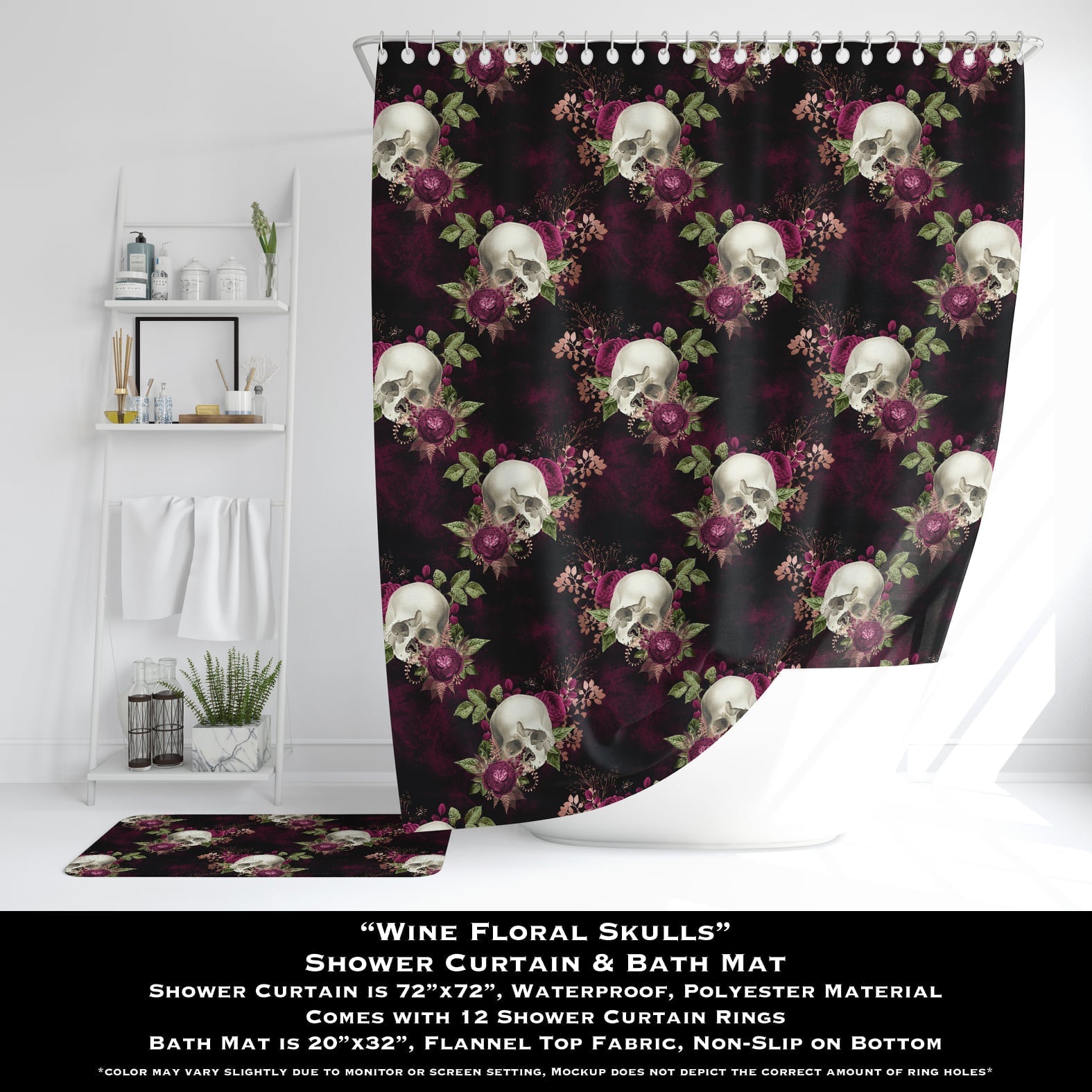 Wine Floral Skulls - Shower Curtain & Bath Mat