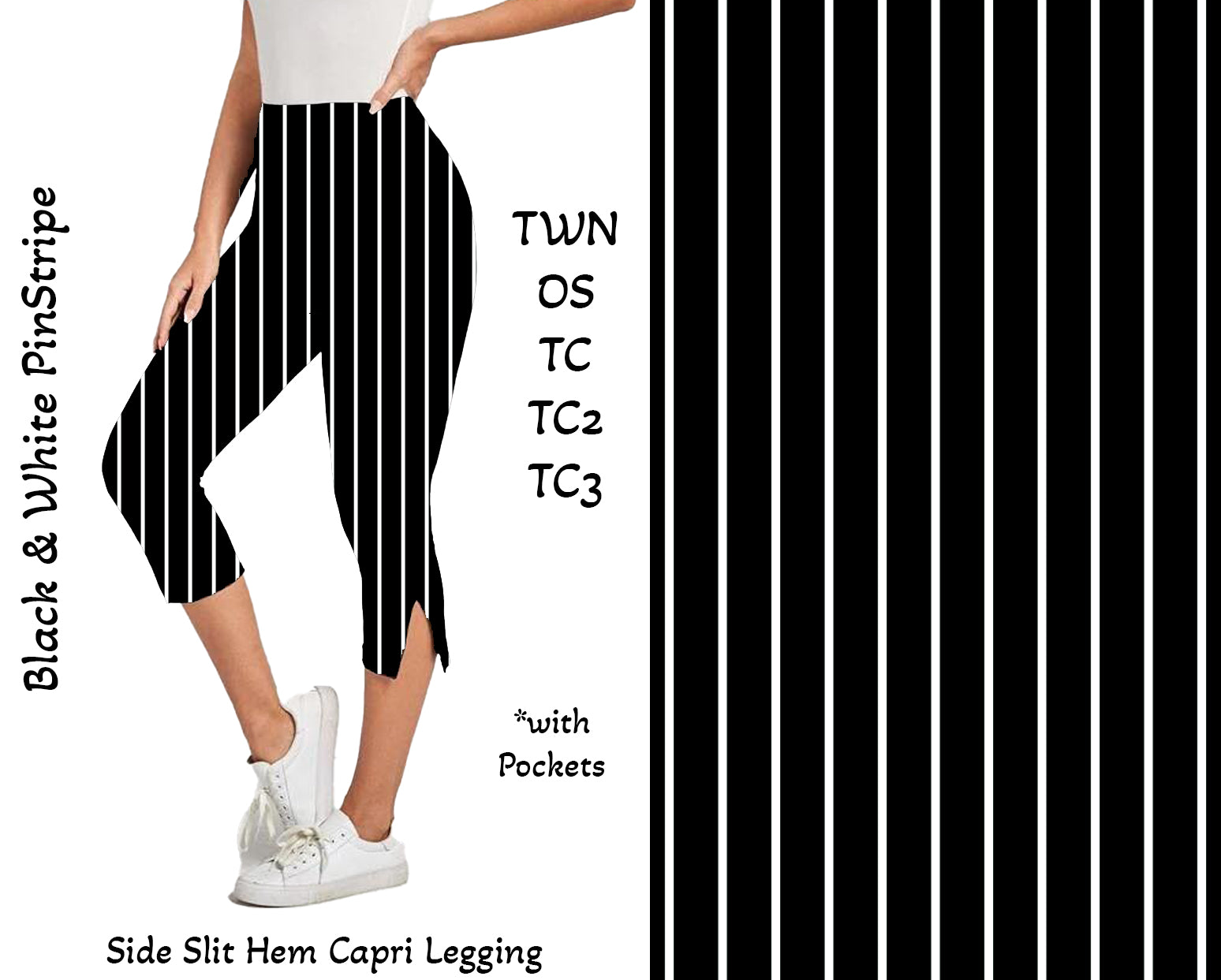 Black and White Pinstripe Side Slit Hem Capri Leggings with Pockets