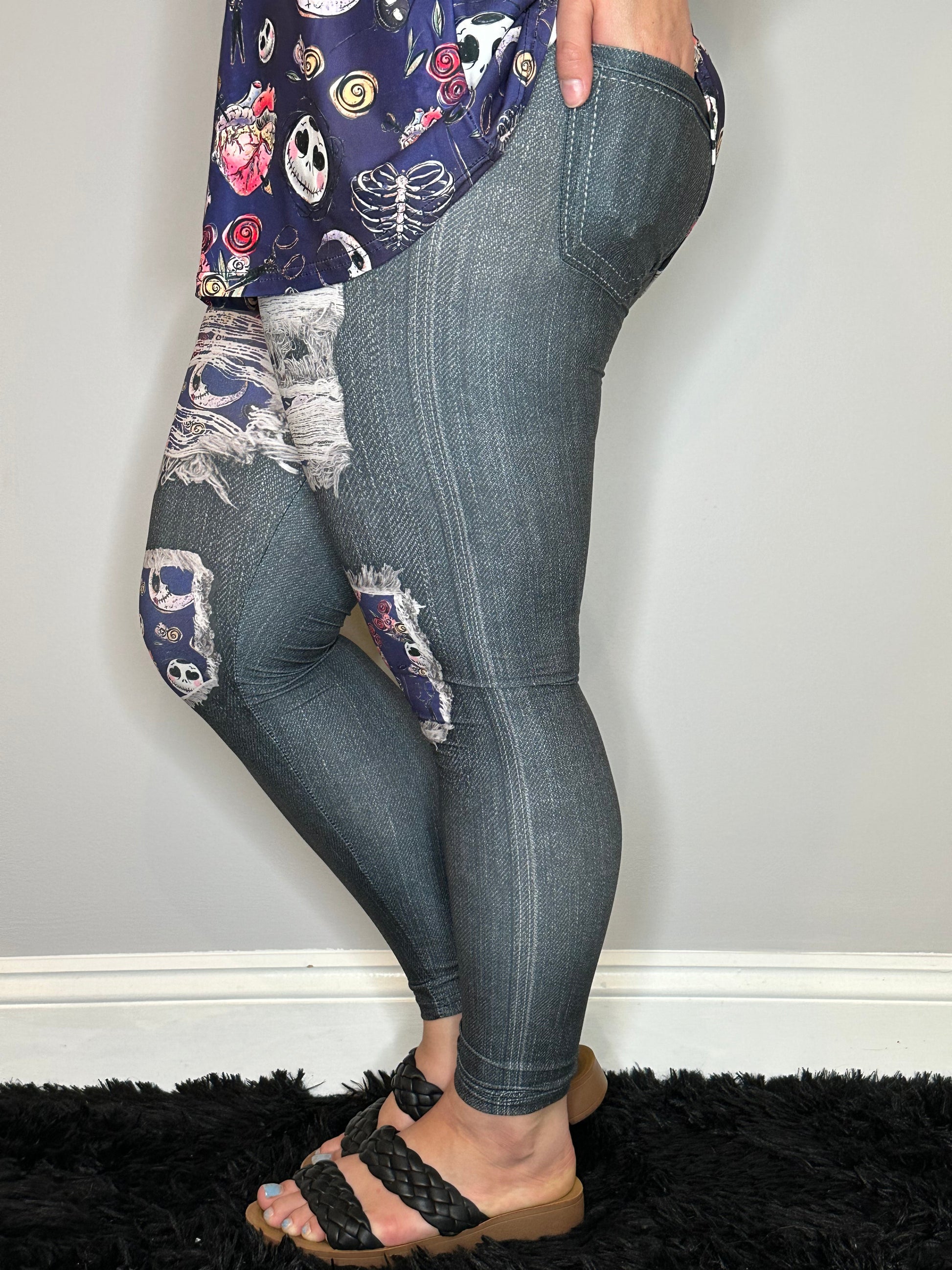 Black Denim Dark Skelly Leggings w/ Back Pockets