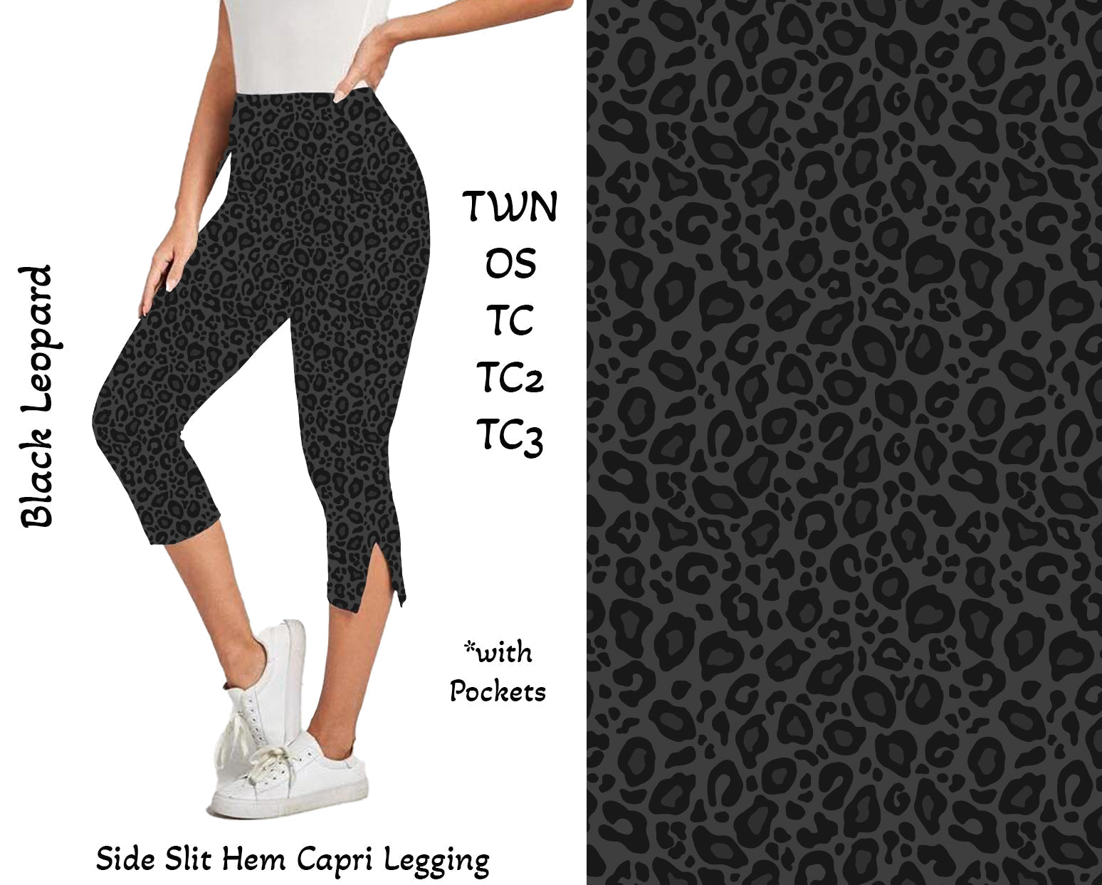 Black Leopard Side Slit Hem Capri Leggings with Pockets