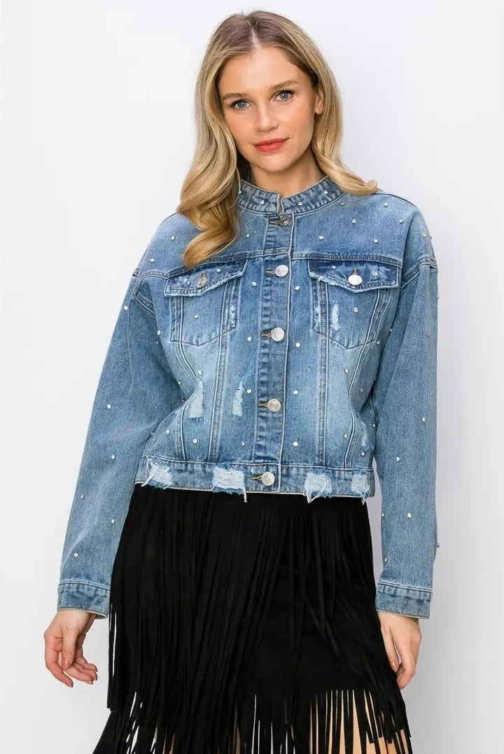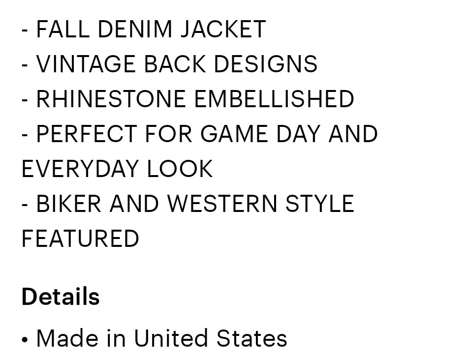 These high quality denim jackets are a perfect accessory to any outfit. Jackets run true to size and the gemstones glisten in the light. Nice deep pockets in the jackets makes carrying items in the pockets secure. These jackets are available in sizes small-3x