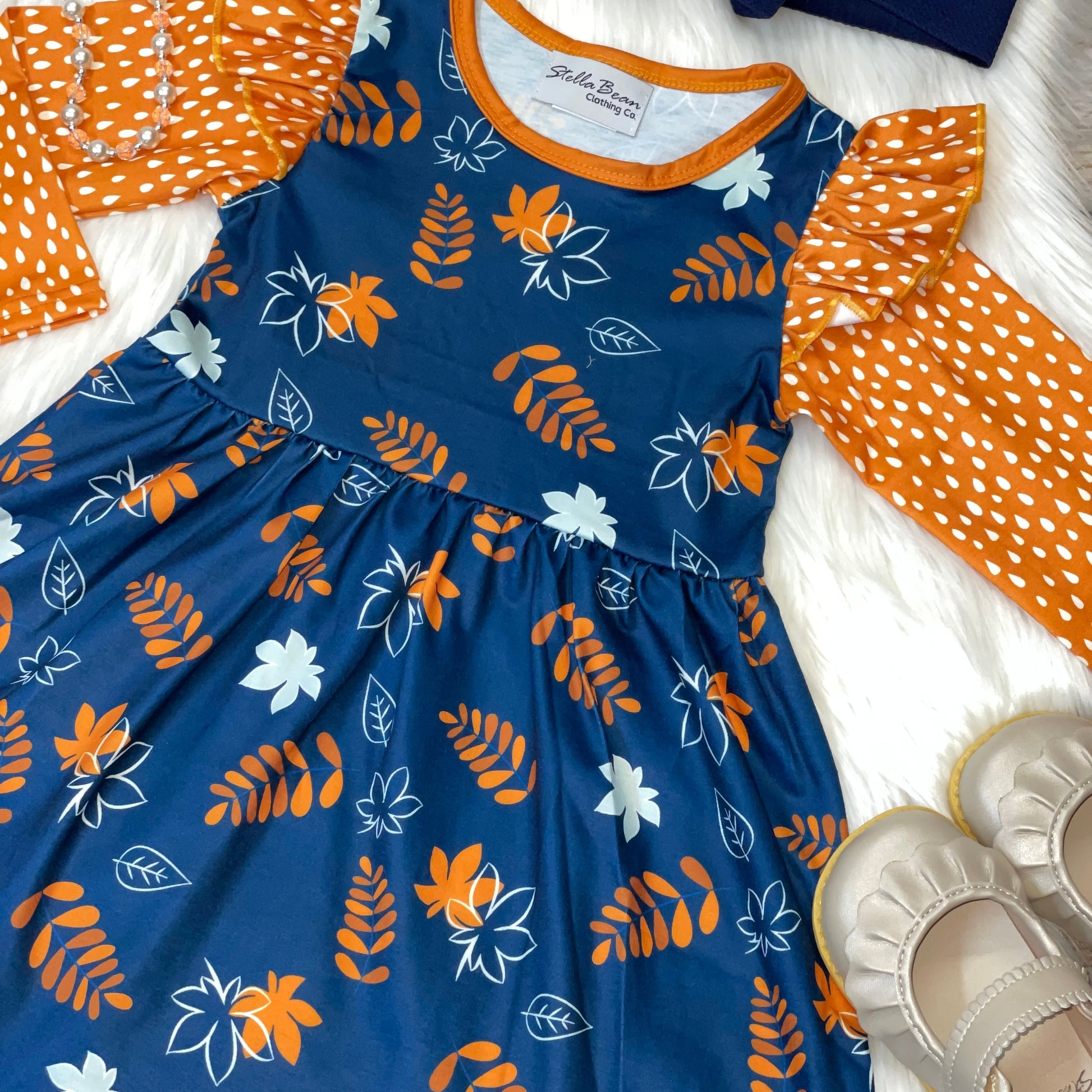 Blue & Gold Fall Foliage Print Long Sleeve Dress