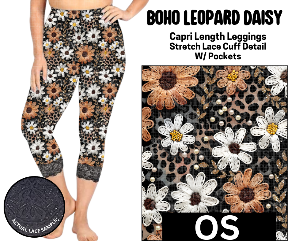 Boho Leopard Daisy Lace Cuff Capris w/ Pockets