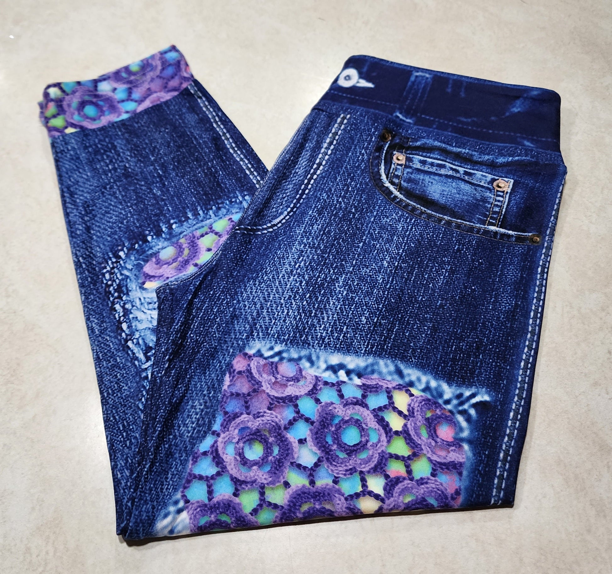 Candy Crochet Flowers Faux Denim Capris
