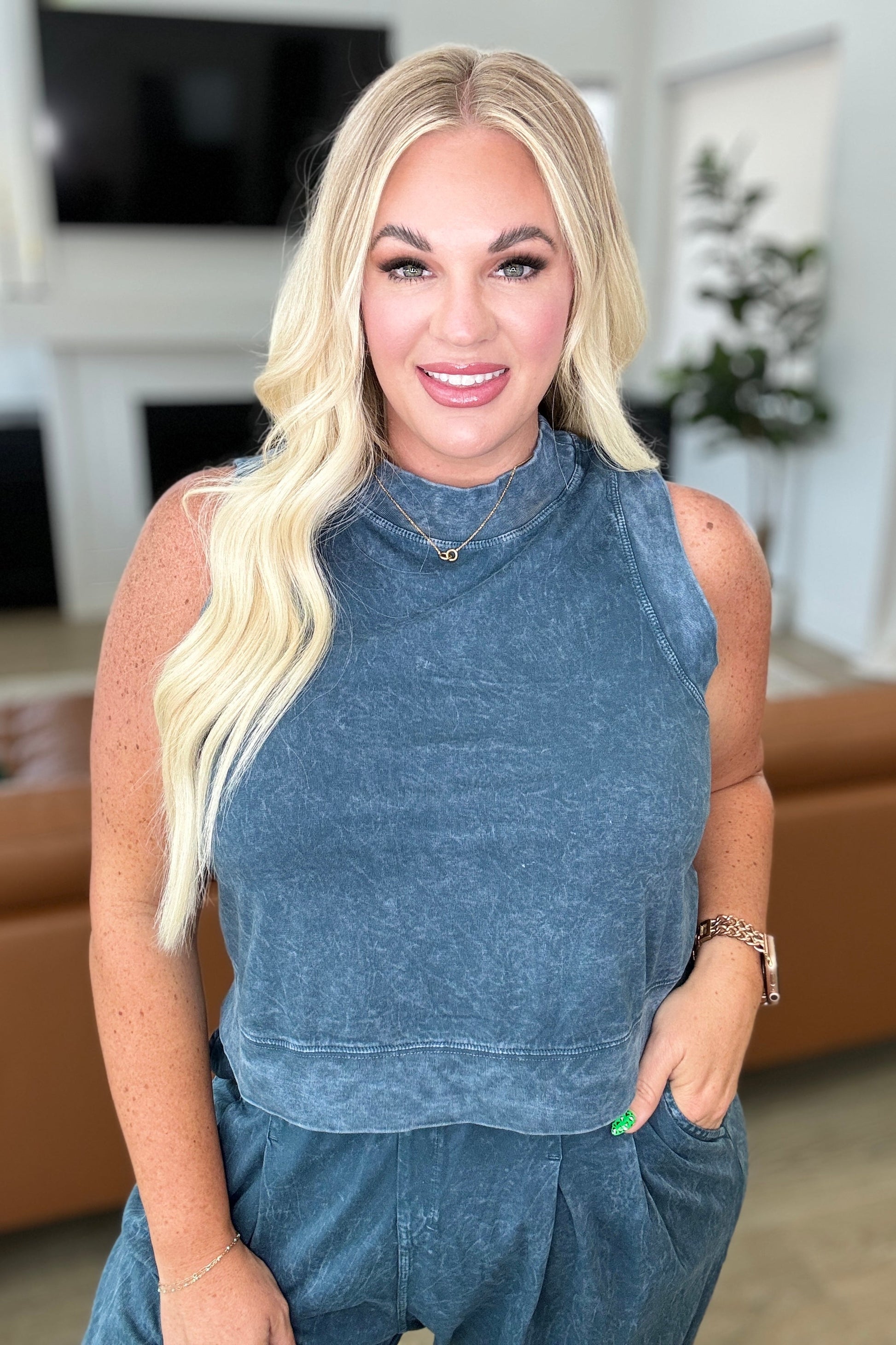 Pump that iron in our Chasing the Gains tank top! This tank top is perfect for hitting the gym or just lounging around in style. With a unique mineral wash and relaxed fit, you'll stand out while staying comfy. Plus, the banded mock neckline, sleeve cuffs, and hem add a trendy touch.