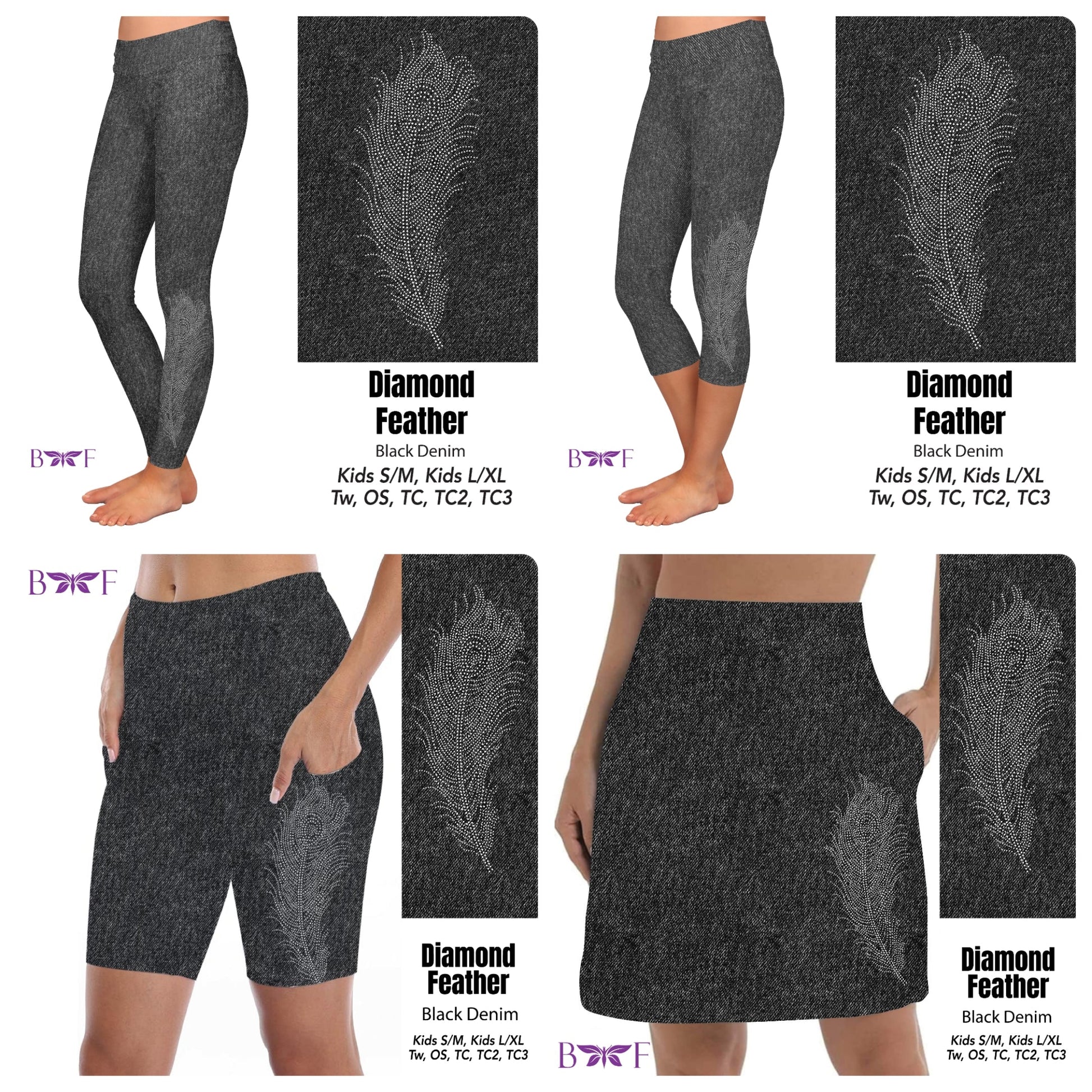 Gemstone Diamond Feather on Black Faux Denim leggings with pockets REAL gemstones
