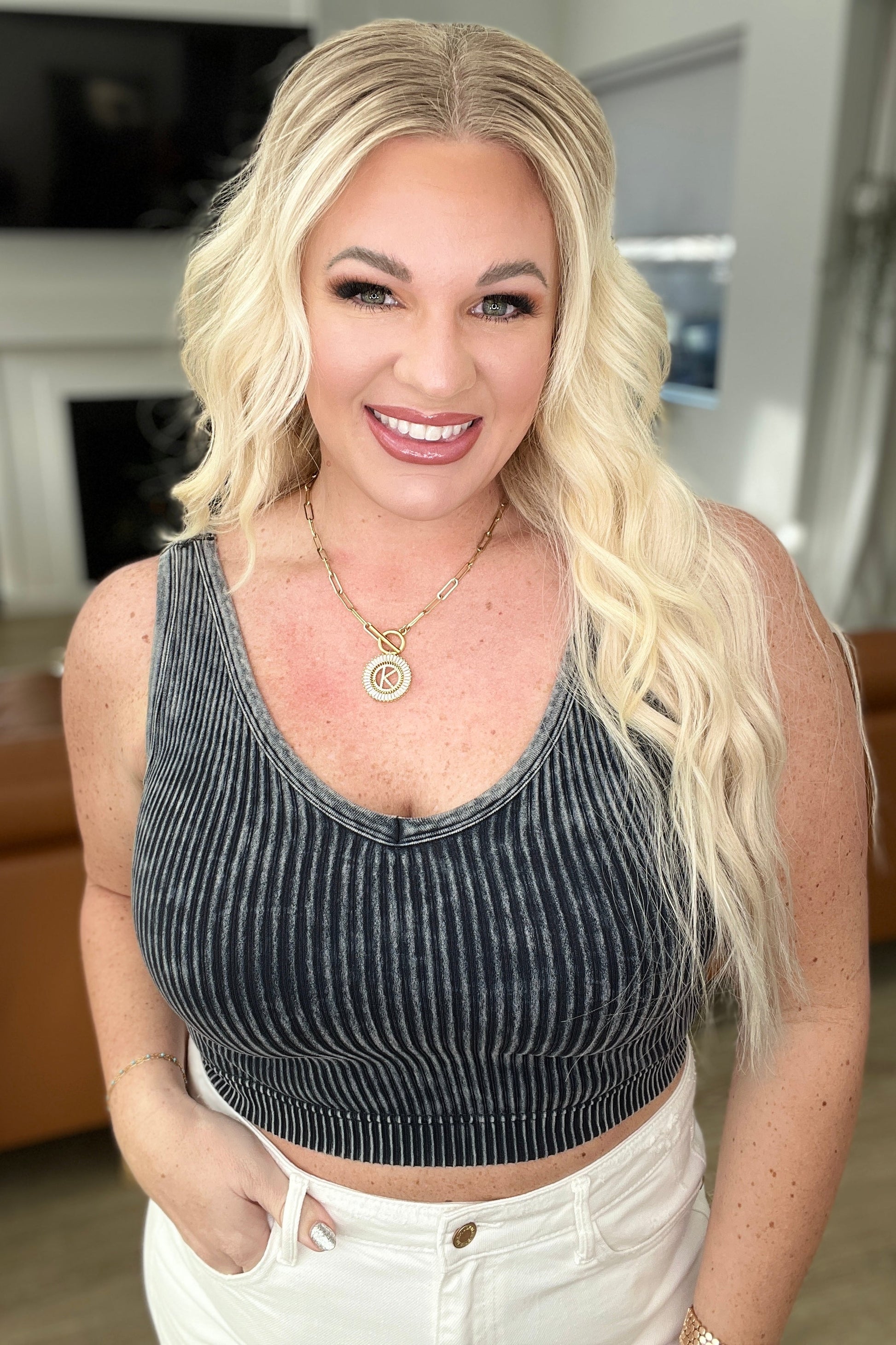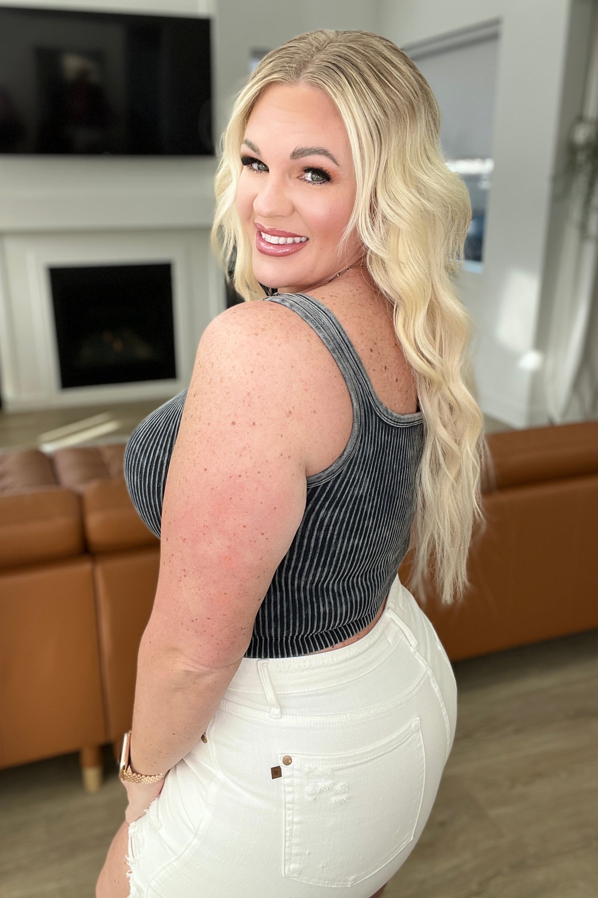 This Effortless Reversible Mineral Wash Ribbed Tank is perfect for those who value versatility and comfort. The unique mineral washed ribbed knit material is super stretchy and can be worn with either a scoop neckline or v-neckline. Whether used as a base layer or standalone piece, this tank is a must-have for any wardrobe.