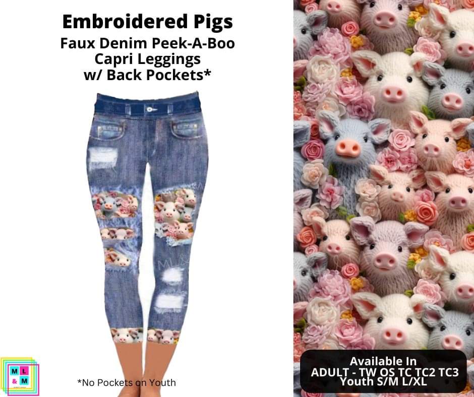 Embroidered Pigs Faux Denim Peekaboo Capris
