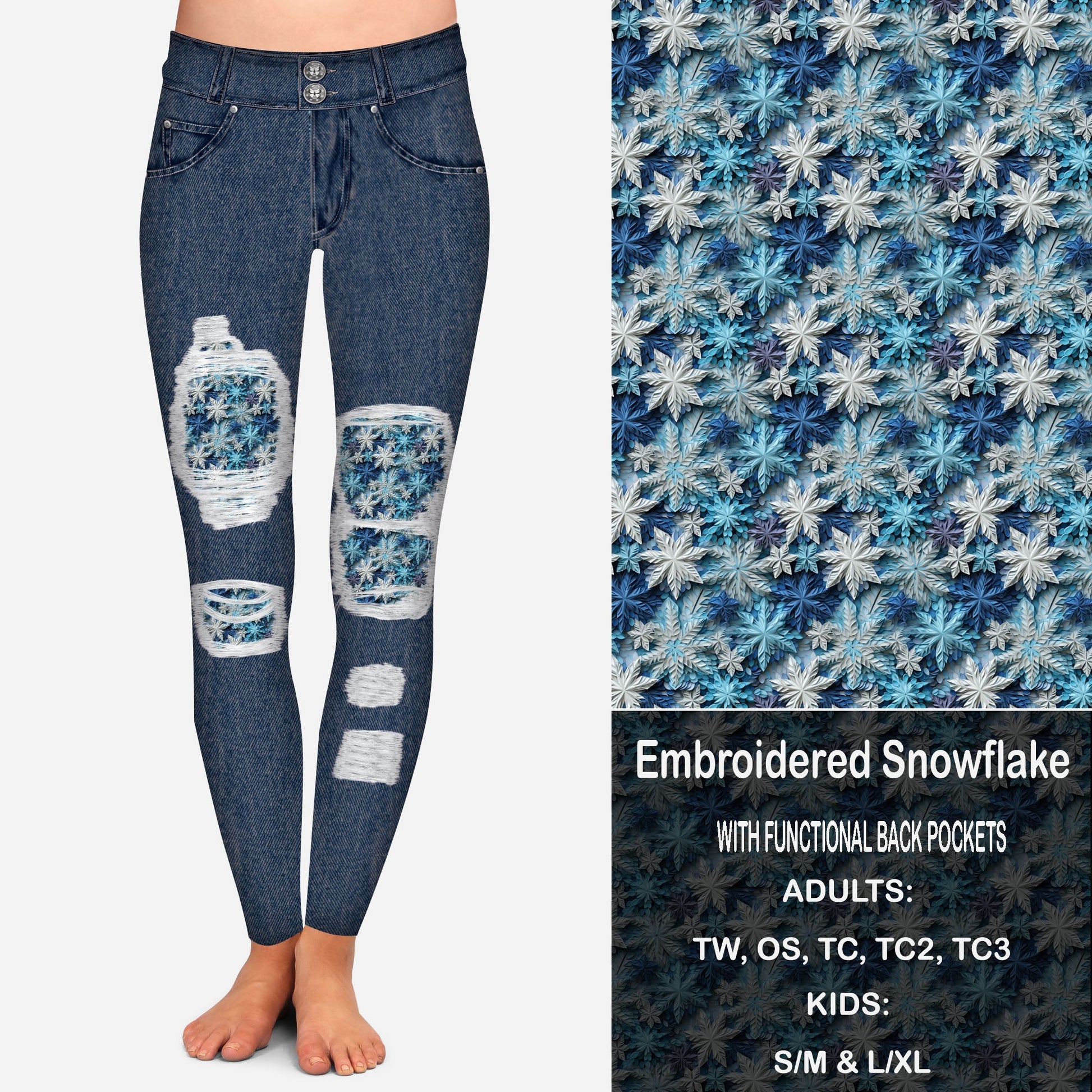 Enchanted Snowflake Faux Denim Peekaboo Leggings with Pockets