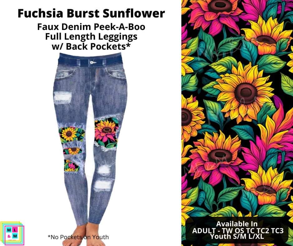 Fuchsia Burst Sunflower Faux Denim Full Length Peekaboo Leggings