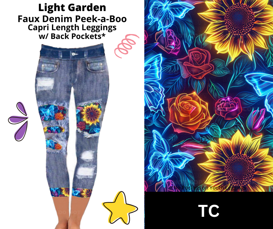 Capri Length Leggings in a Faux Denim Peekaboo design. Functional back pockets.
