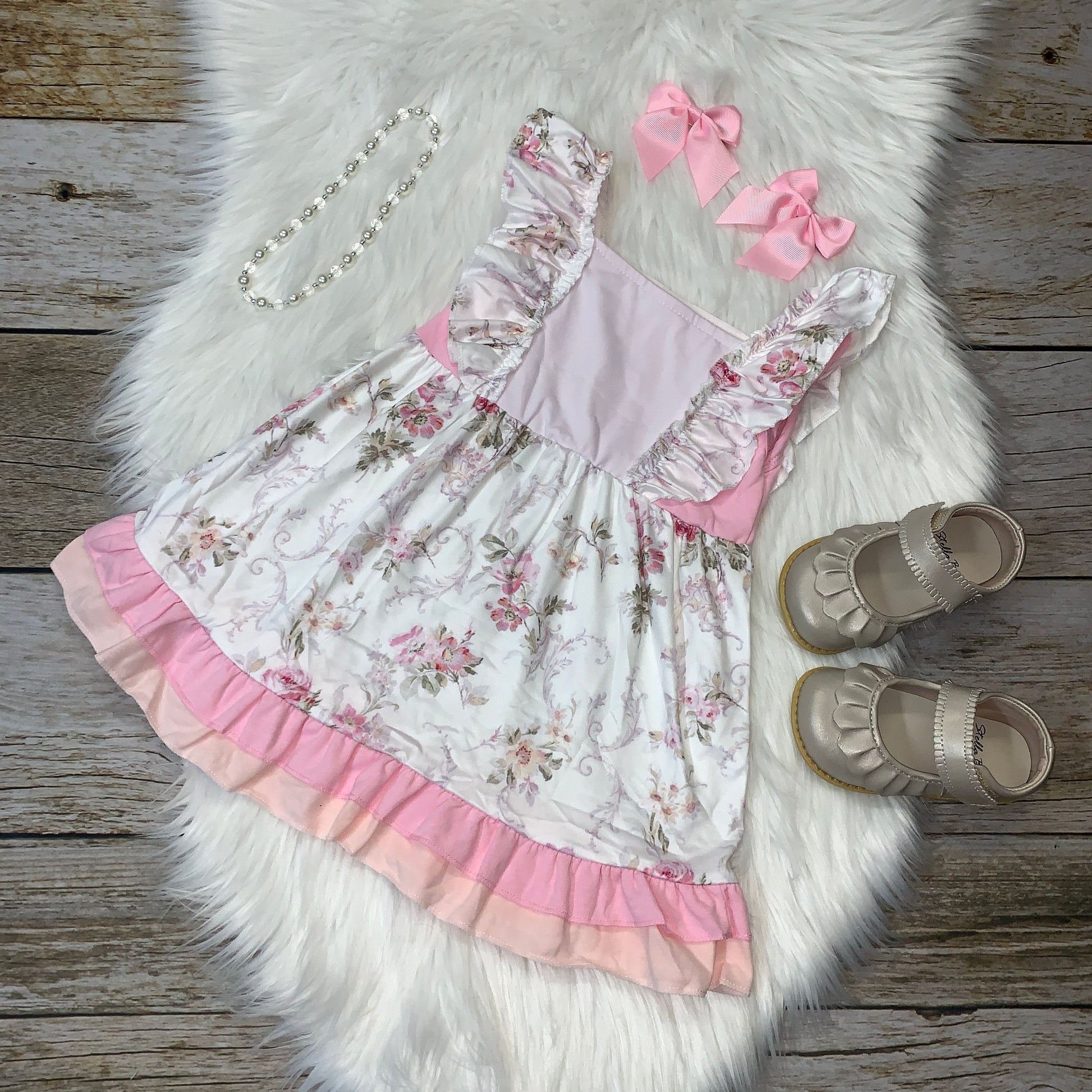 Pink Floral Print Flutter Sleeve Double Ruffle Dress