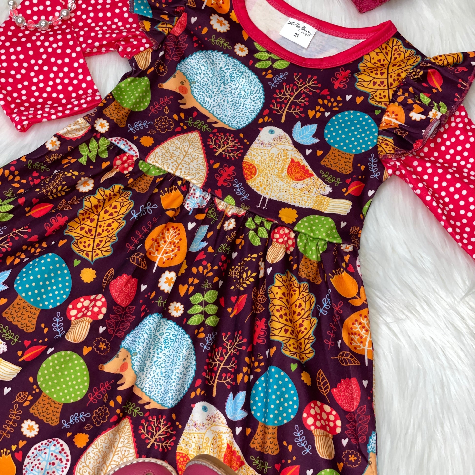 Pink & Plum Woodland Flutter Sleeve Dress with Polka Dot Sleeves