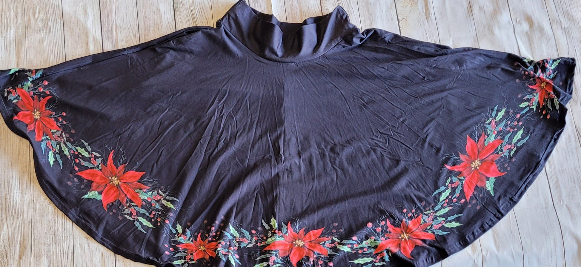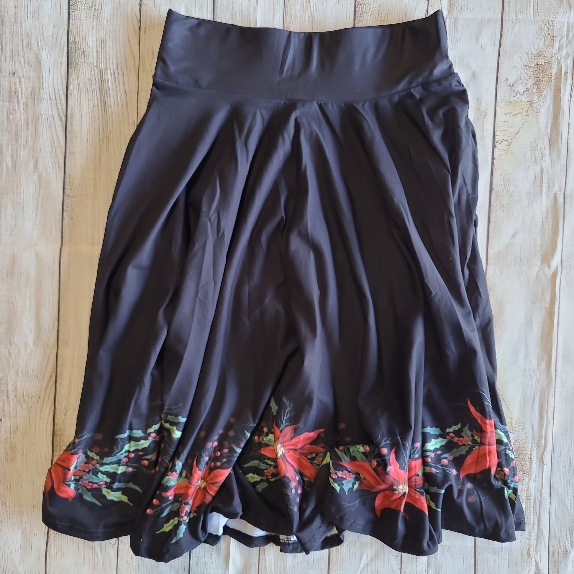 Black skirt with poinsettia flowers around the bottom hem. Skirts have pockets, and yoga waist.