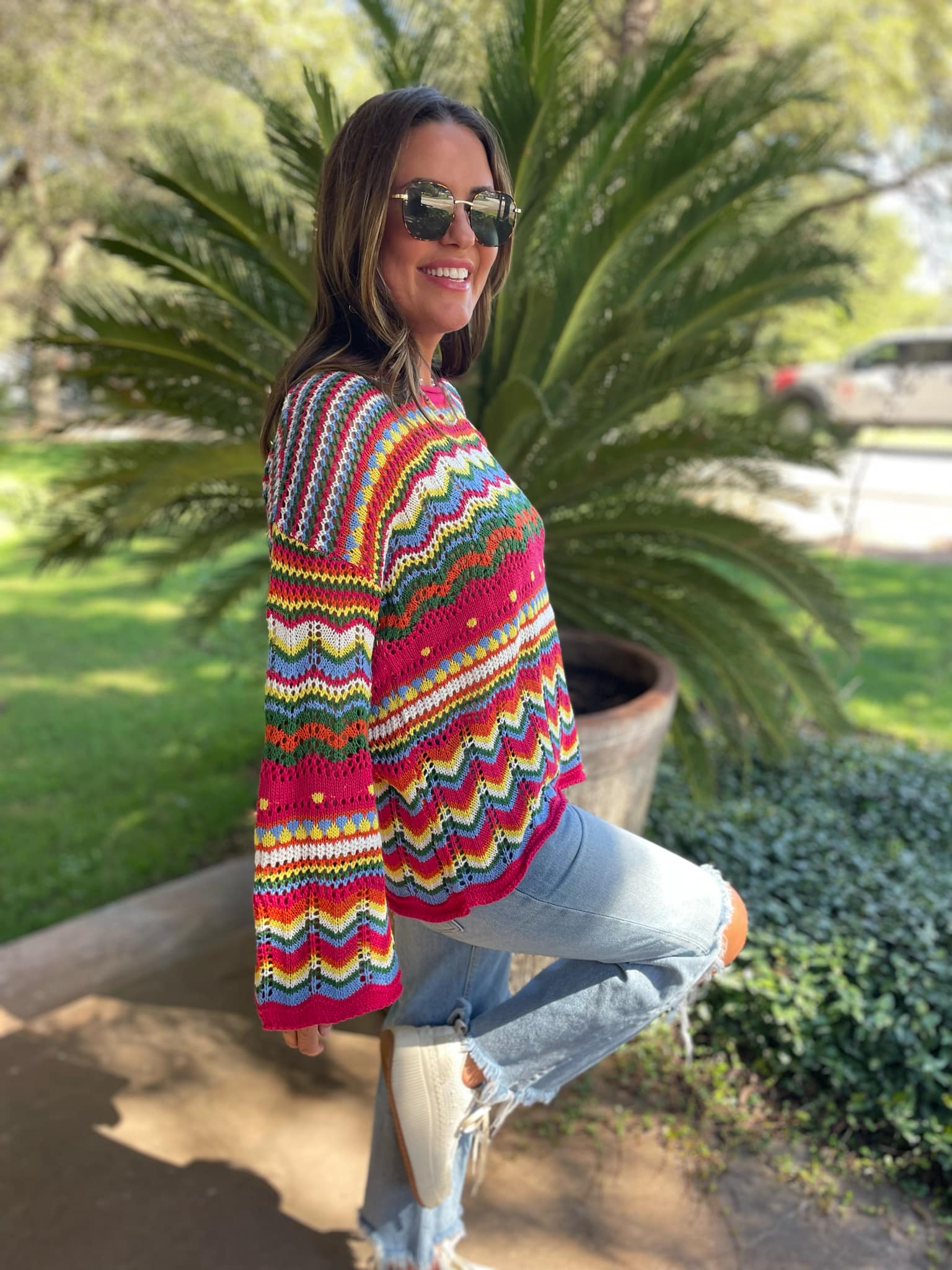 The open knit of this colorful sweater makes it a perfect seasonal transition piece! True to size with a drop shoulder and slight bell sleeve