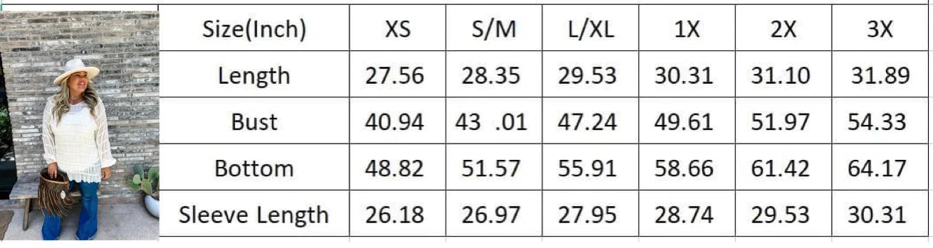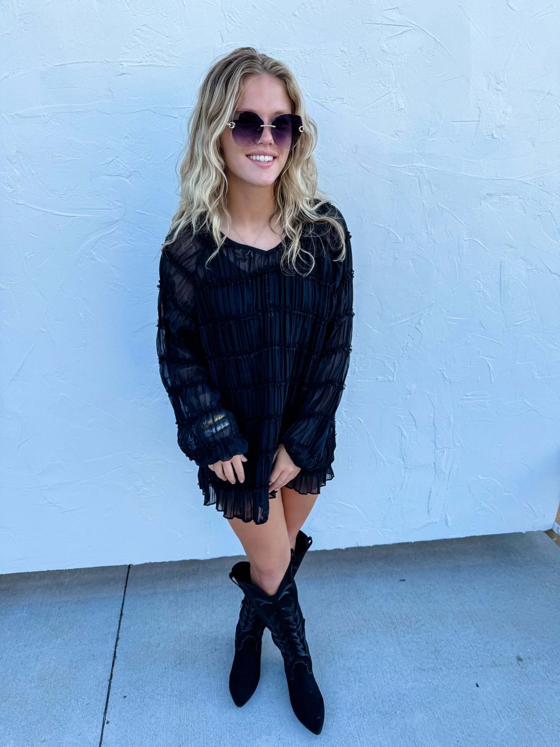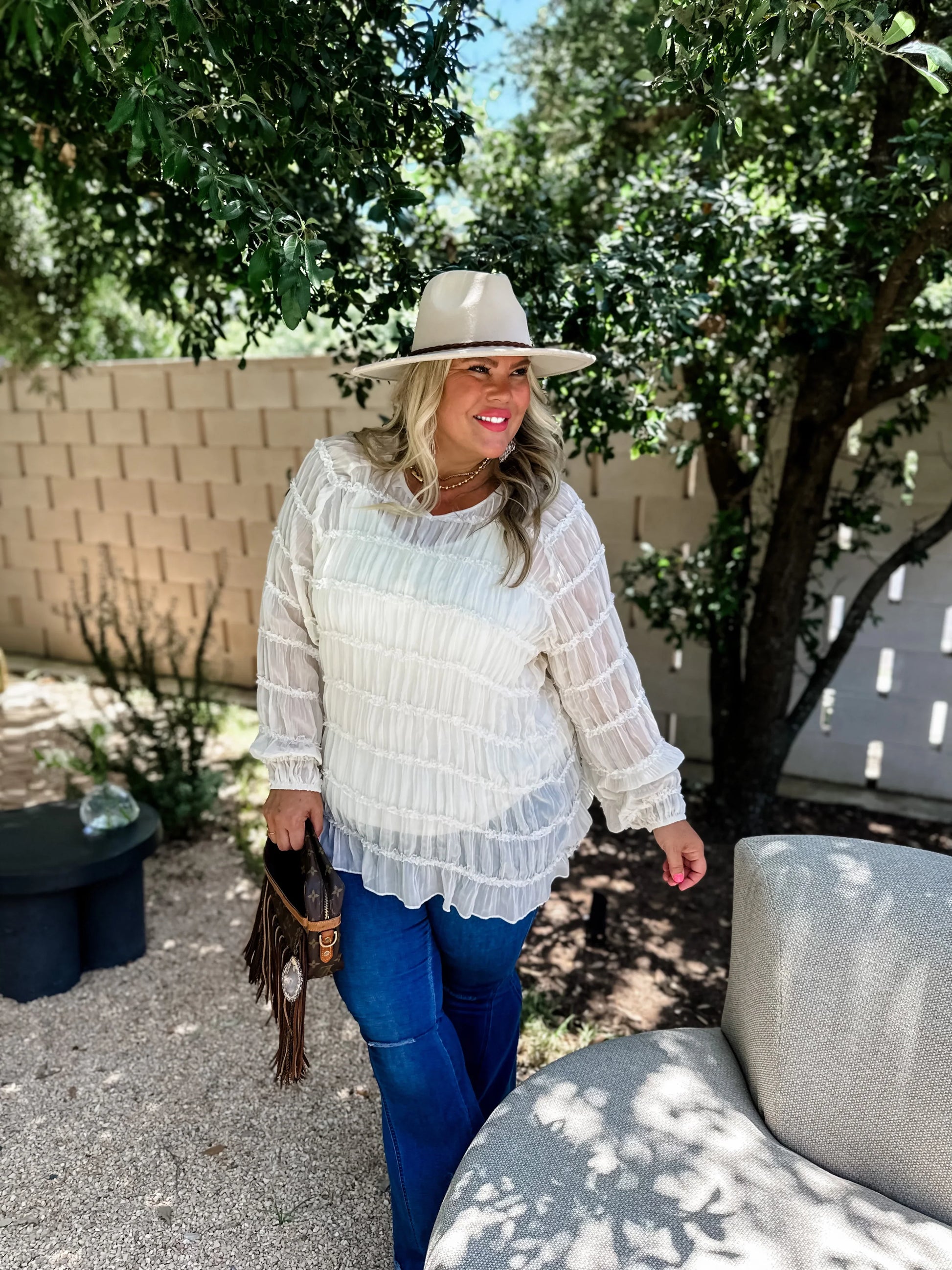 This sheer lacy top is perfect mix of boho and elegance! Features tiered ruched lace (that has slight stretch). Wrists have a stretchy elastic band and neckline is a slight V neck. Paired with a cami underneath (cami not included!)