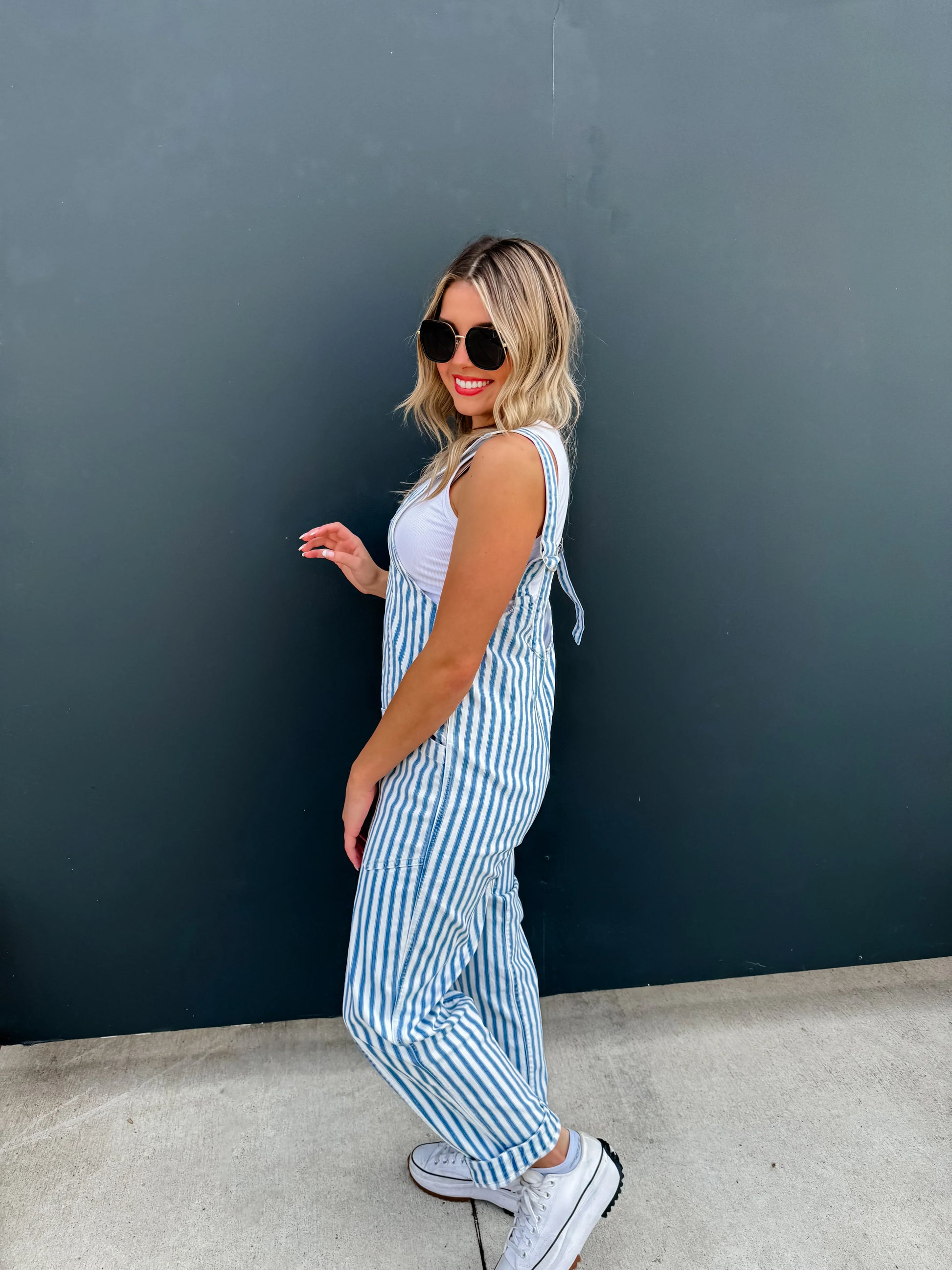 One of our best-selling rompers is back and now in an adorable NEW stripe fabric! Lightweight with stretch and great for Spring! Slouchy relaxed pull-on style with oversized front patch pockets and adjustable back straps. These are SO comfy and true to size.