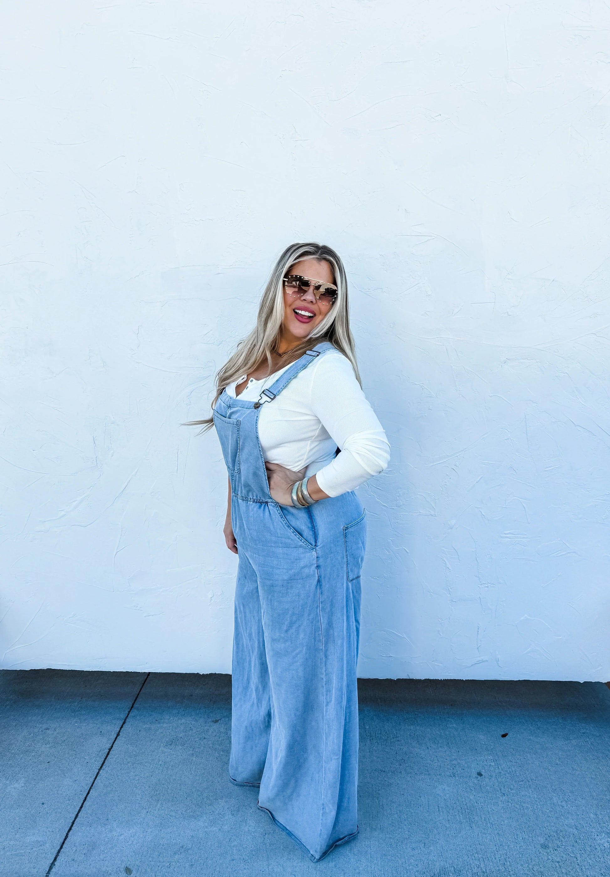 Our Boho Denim Overalls are crafted from soft stretchy tencel denim. This style features a wide leg fit, an elastic waist with side zipper and adjustable straps for a custom fit.
