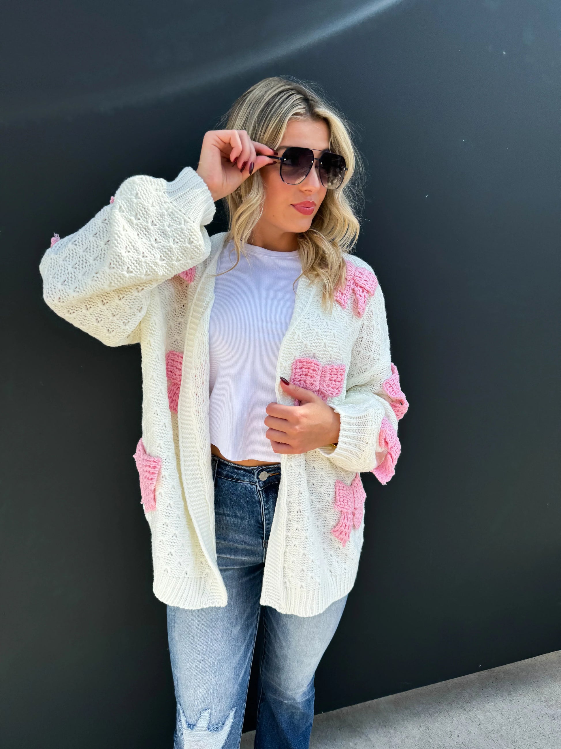 The cutest chunky knit bow cardigan that is so versatile!! Features bubble sleeves. Great stretch. No pockets.