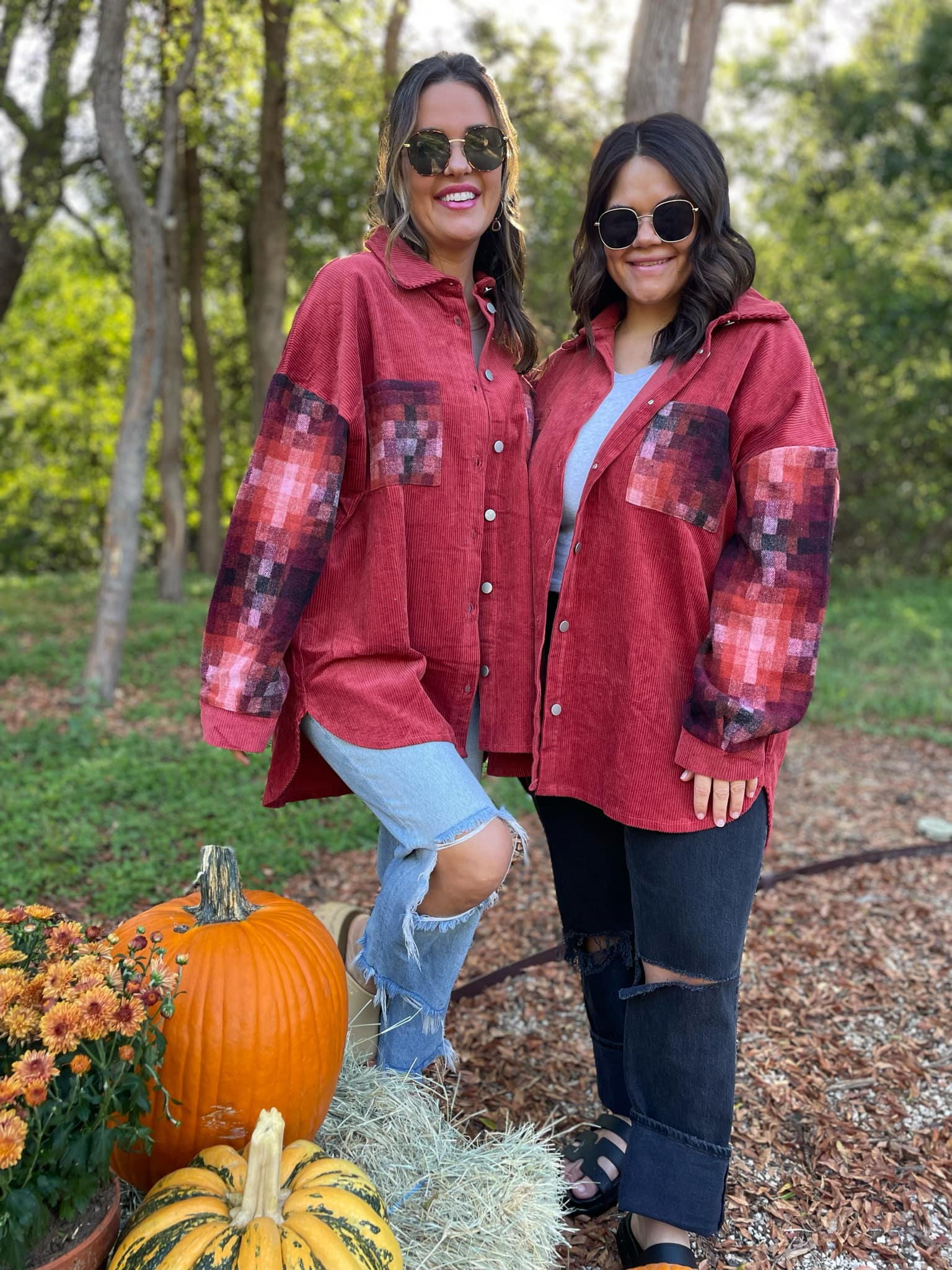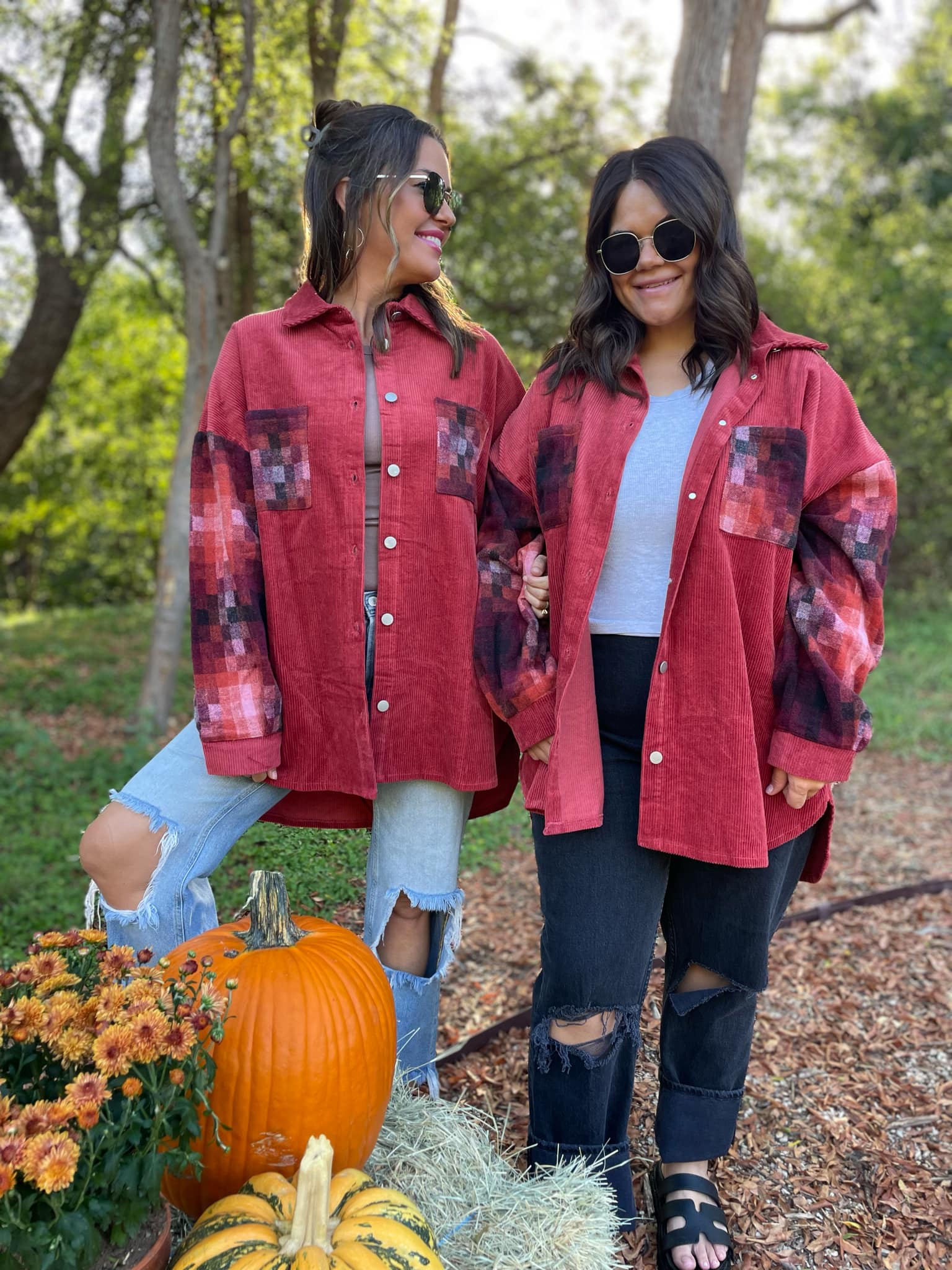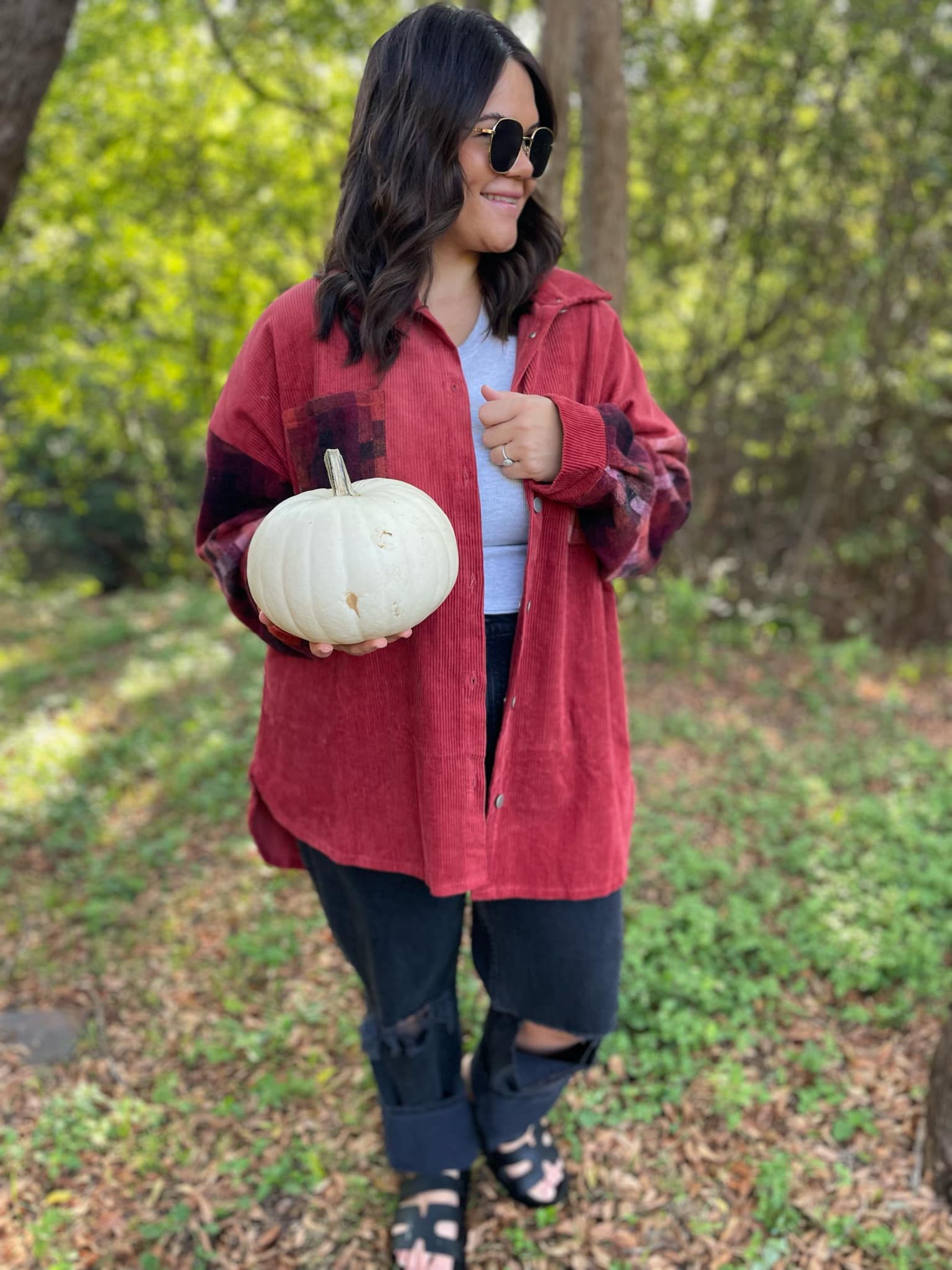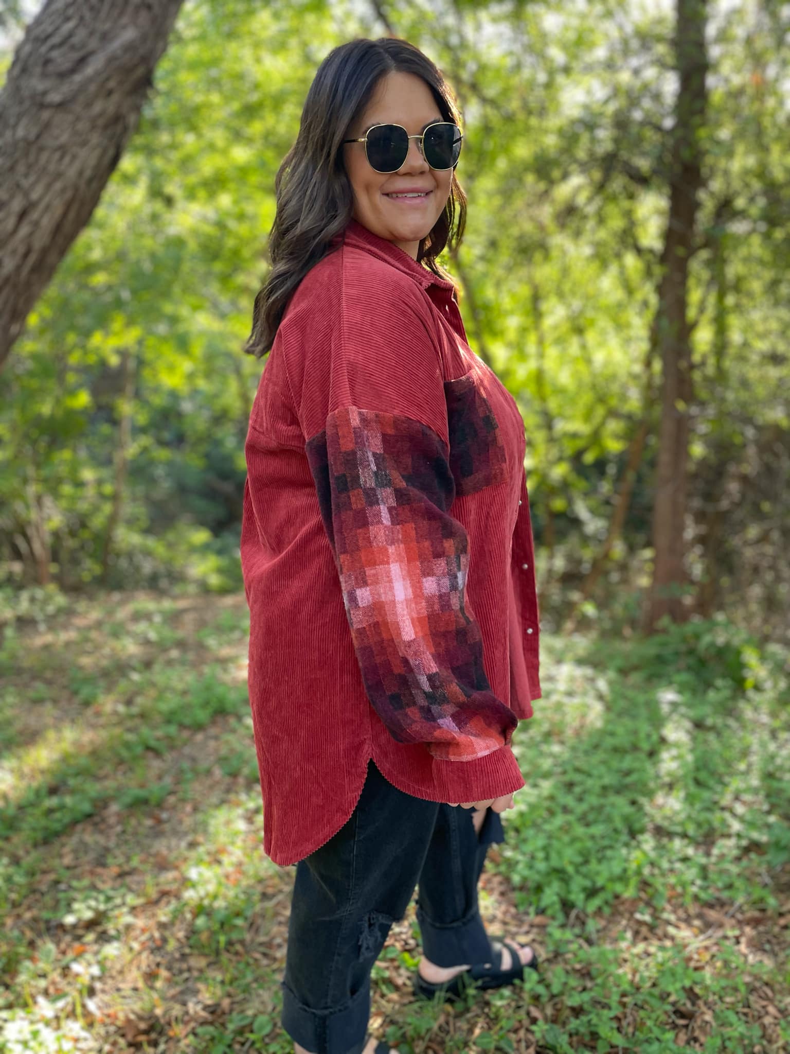 This corduroy shacket has the most beautiful combination of colors in the checkered sleeve and pocket accents! With functional buttons, a slight high-low hemline, drop shoulder and plenty of coverage for leggings.