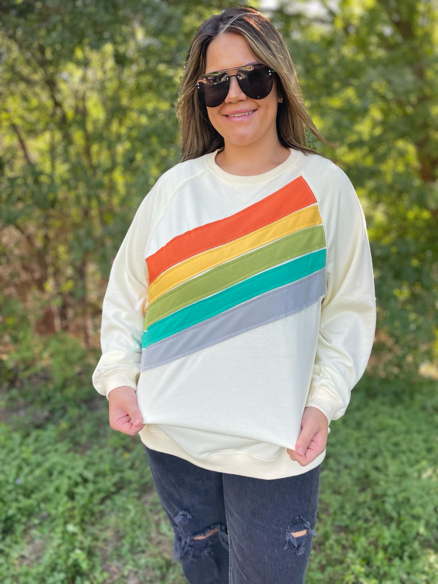 This rainbow pullover is giving us all the retro feels! We love the raw edge detailing of the stripe details, and the colors really pop on both the black and cream options. It's a medium weight french terry so will transition well between seasons.