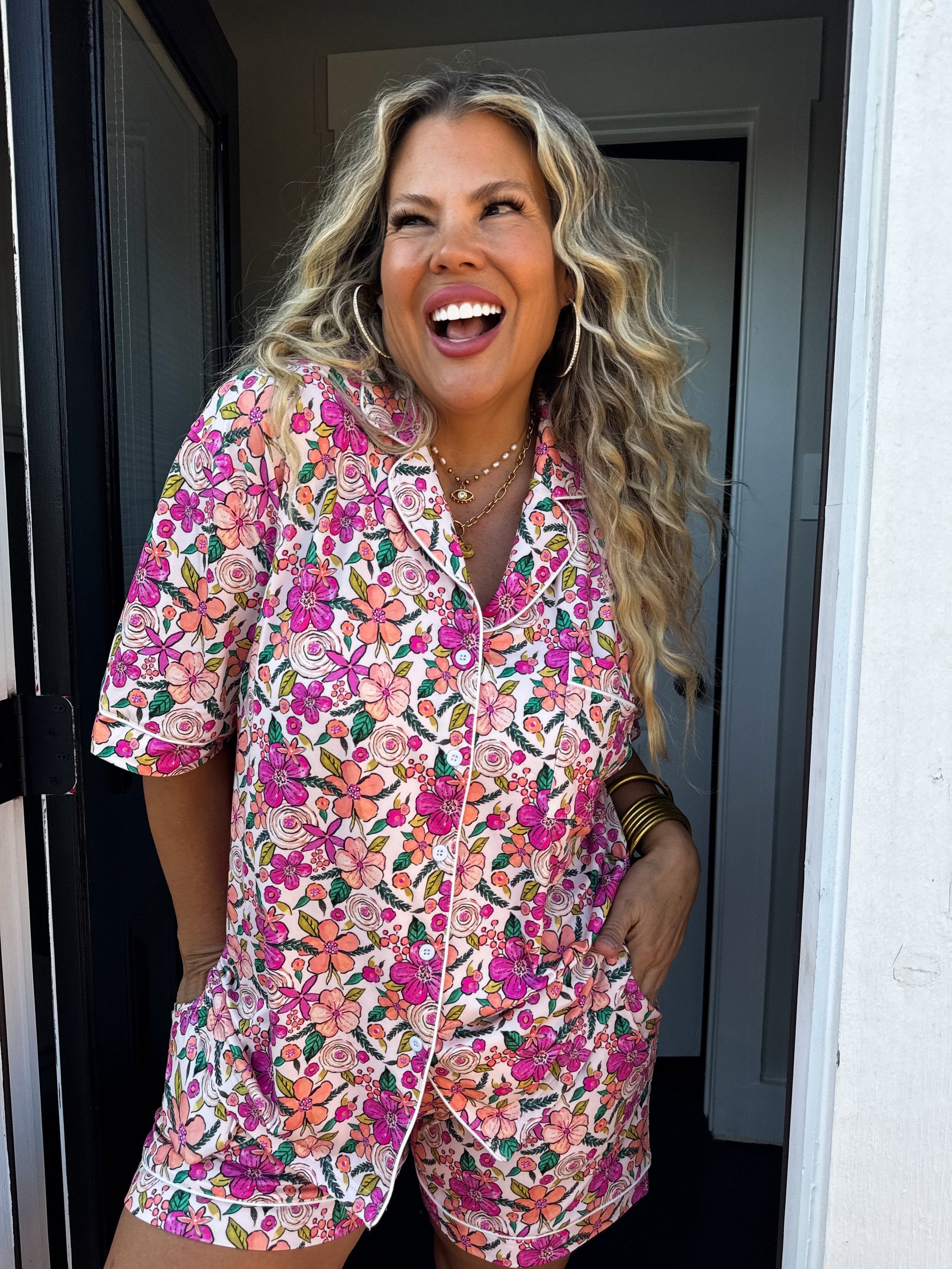Our Luxe Pj Lounge sets are the perfect sleep set for both comfort and style. Features a button-up top with short sleeves and matching SHORTS, with cute designs that will keep you looking good while you relax. The fabric is ultra-soft, STRETCHY and lightweight for a relaxed feel. Pants have pockets and elastic waist. Feature solid color piping on all trim for an extra "luxe" look!