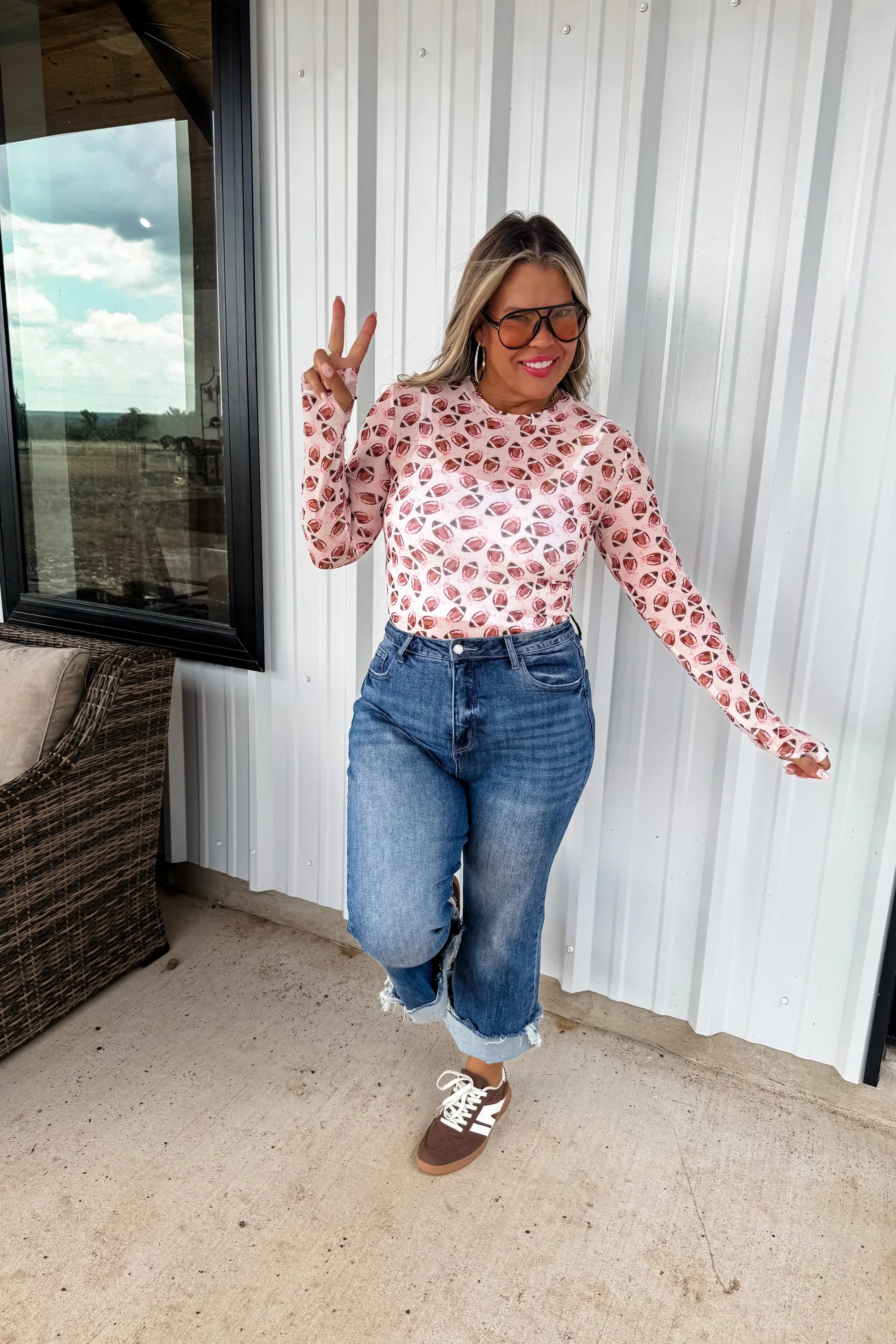 OUR FOOTBALL PRINT IS HERE!! Super cute for layering, this sultry stretchy mesh print long-sleeve top features a totally sheer design. Perfect worn alone or paired under your favorite cardigan, vest or sweater! Crew neck and thumbhole details.