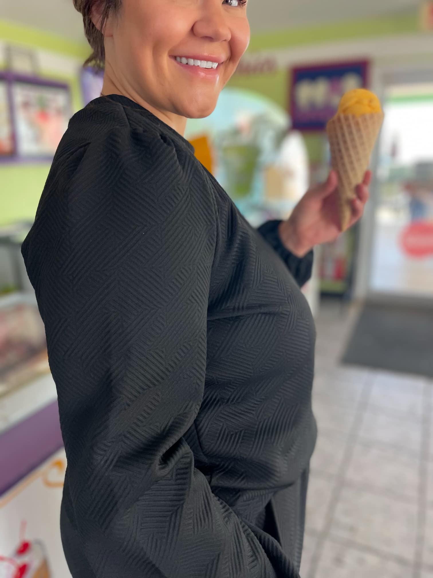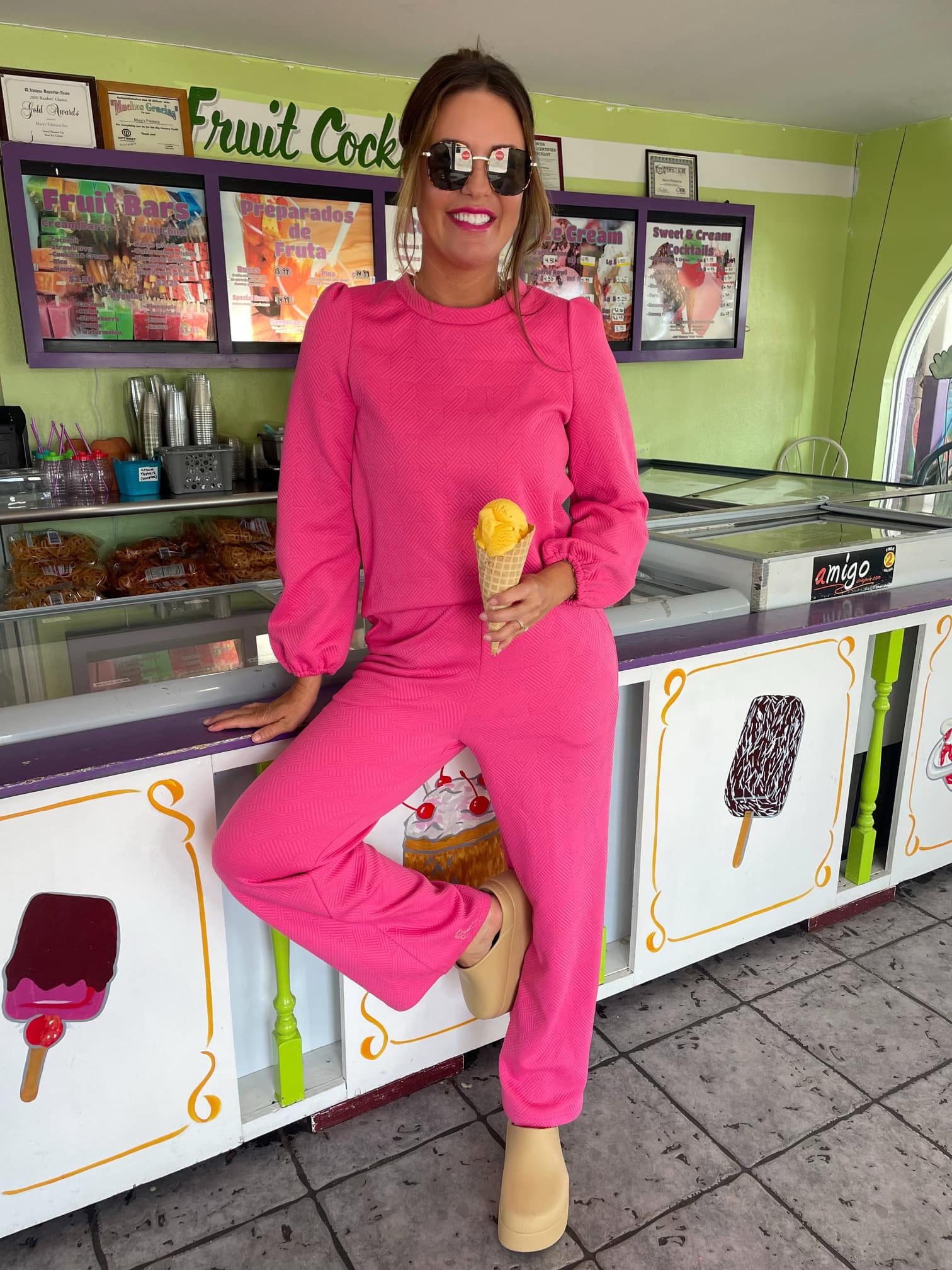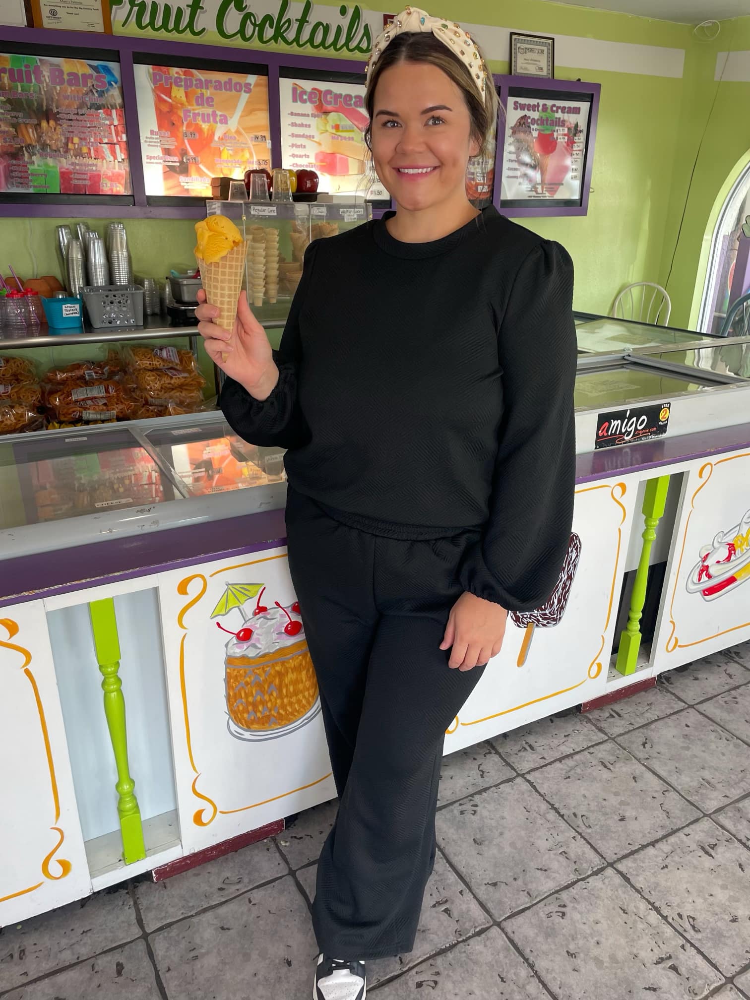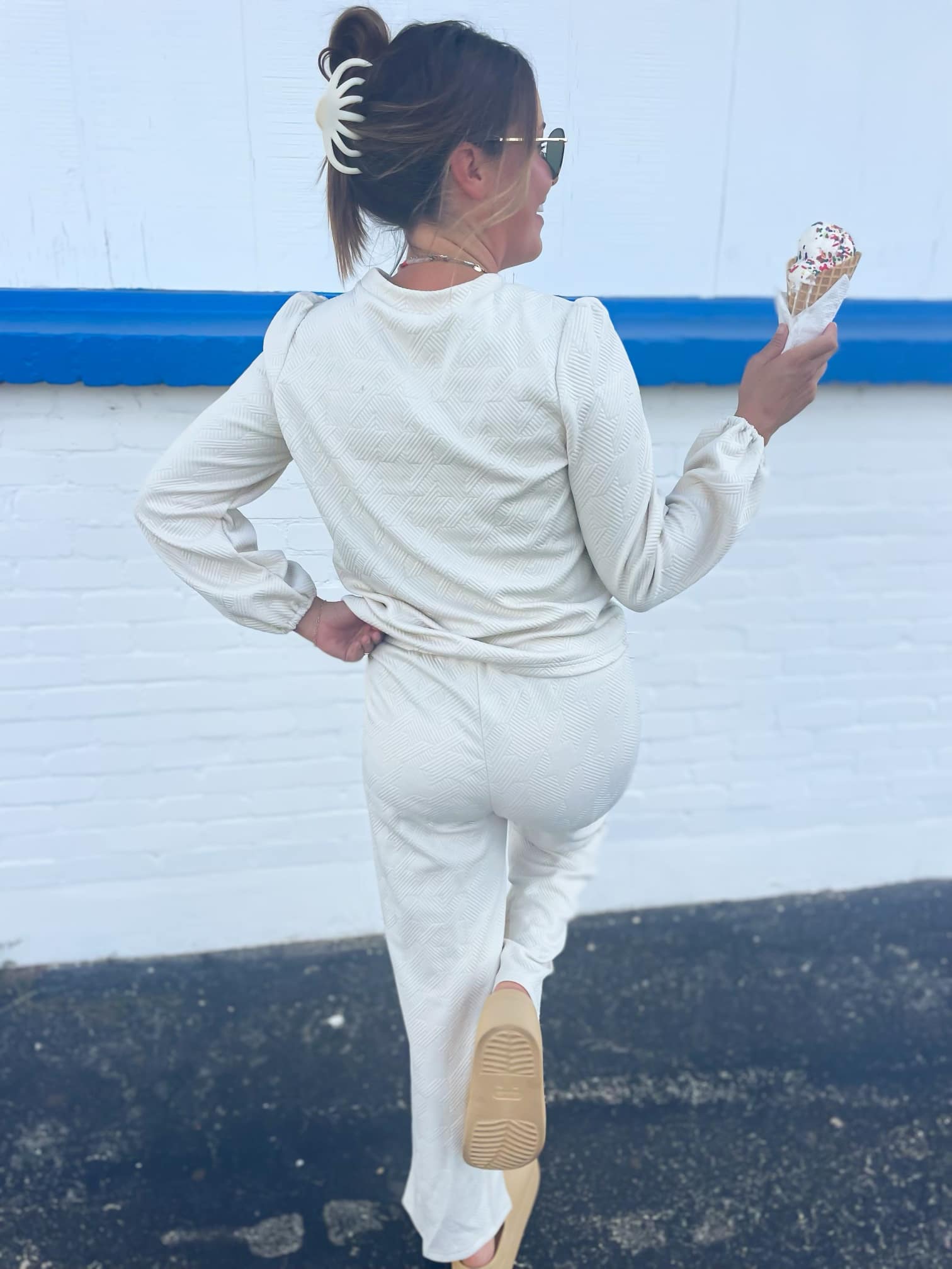 Your loungewear for fall just got a lot more fabulous with this gorgeous quilted set! Available in beige, black and pink, we love the textured fabric and the puff sleeve detail.