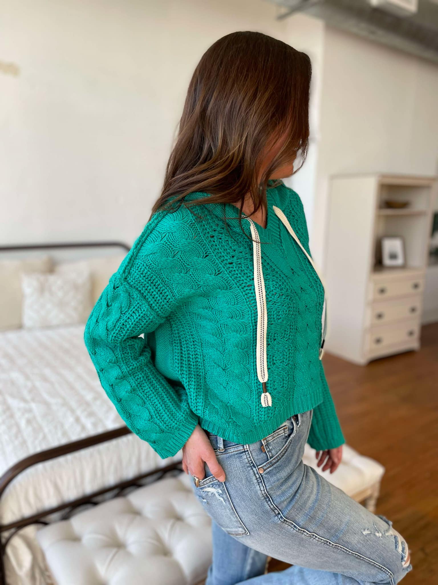 This sweater mixes the cozy comfort of cable knit with two beautiful spring colors! Featuring a slightly cropped fit, drop sleeves, v-neckline, and a functional hood with contrasting string.