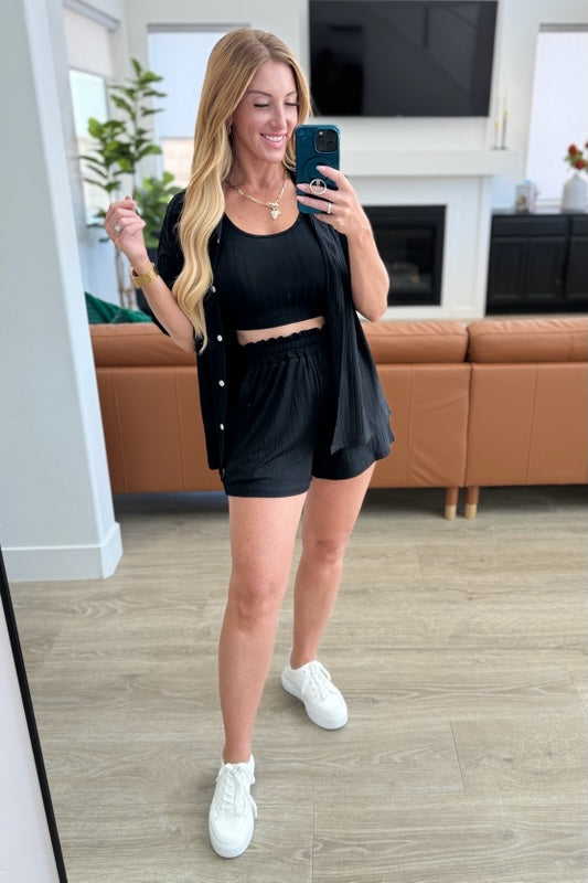 - Set includes: button-up oversized top, brami-style cropped tank, & elastic high waist shorts