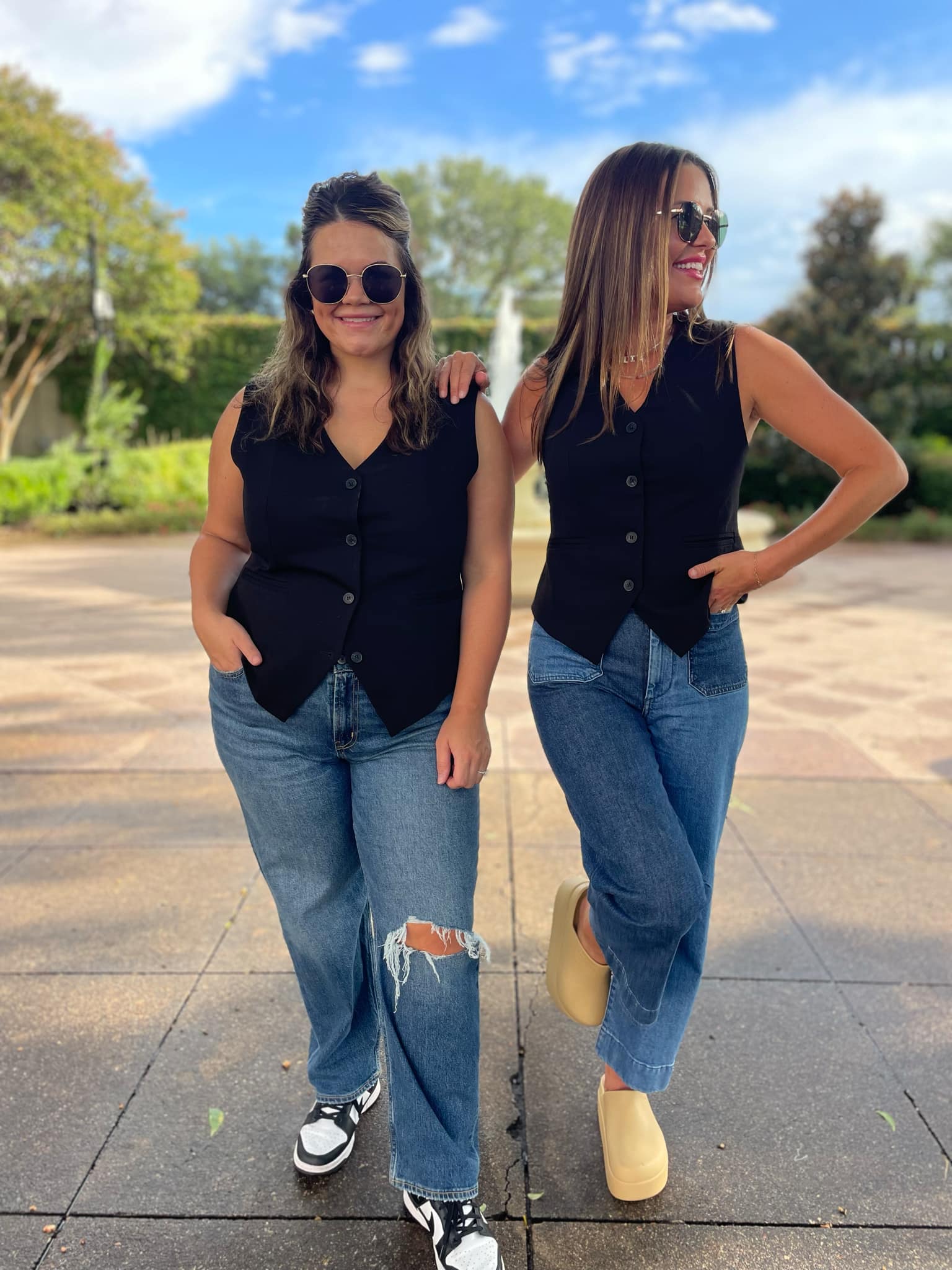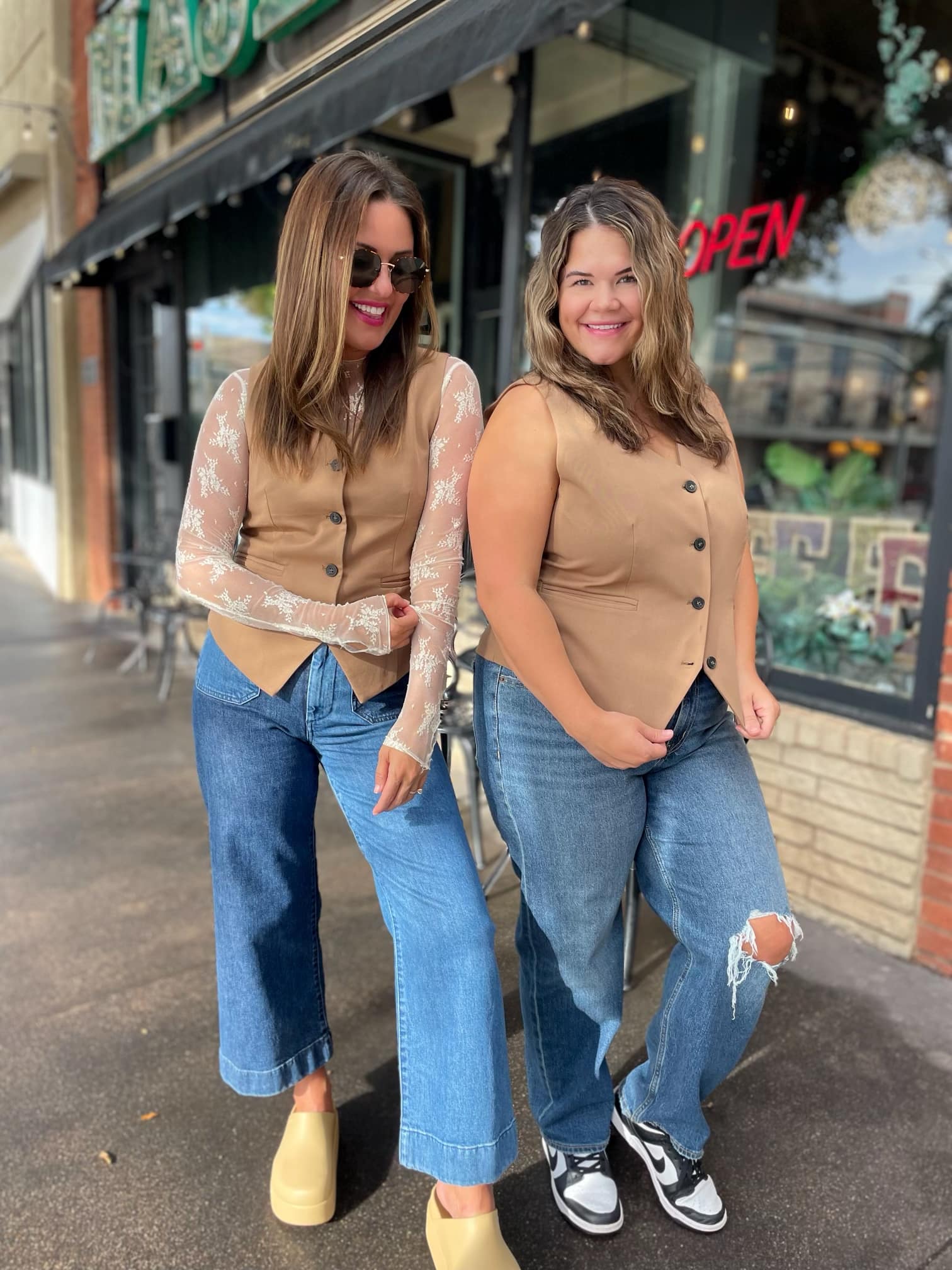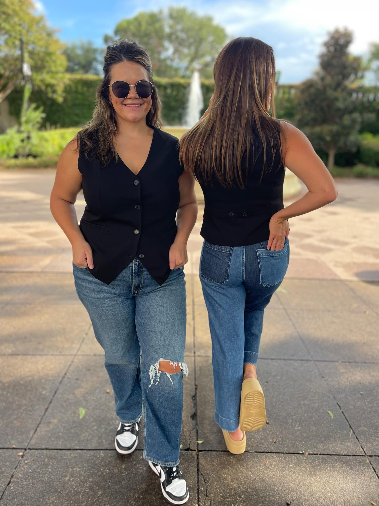 Our new tailored vests are available in three staple colors and offer tons of style and versatility! Featuring four functional buttons with slit pockets and a button cinch detail to customize your perfect fit.