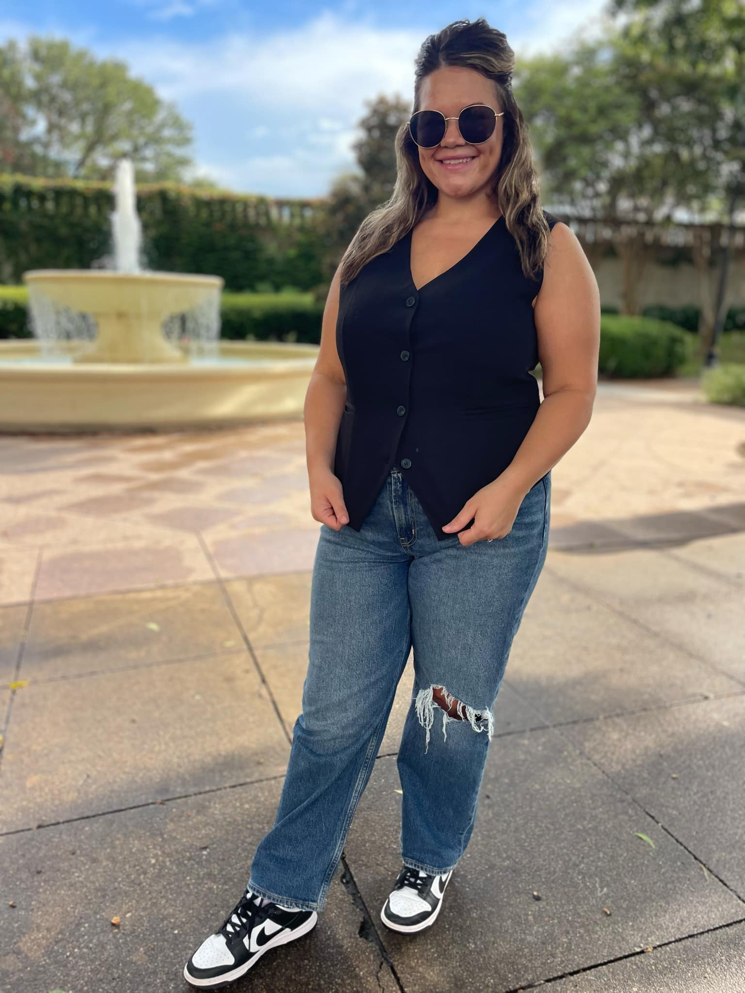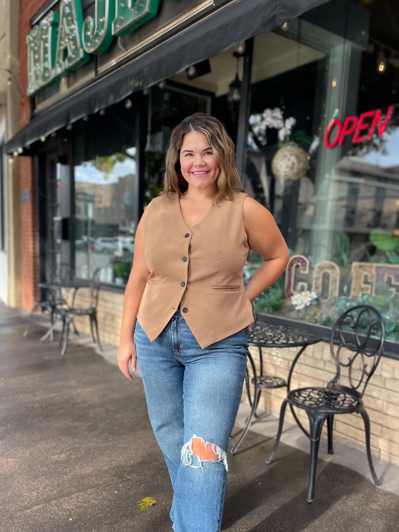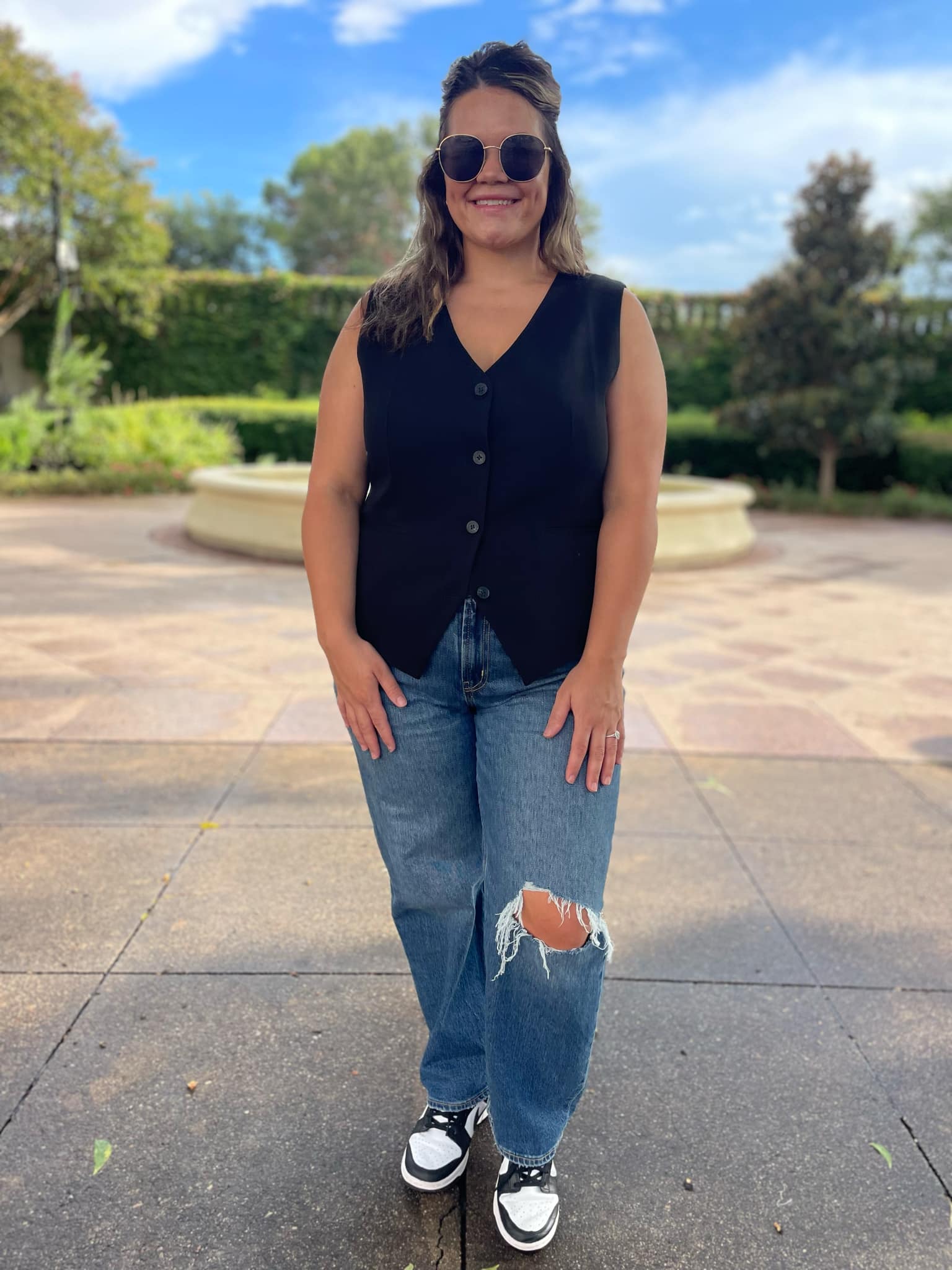 Our new tailored vests are available in three staple colors and offer tons of style and versatility! Featuring four functional buttons with slit pockets and a button cinch detail to customize your perfect fit.