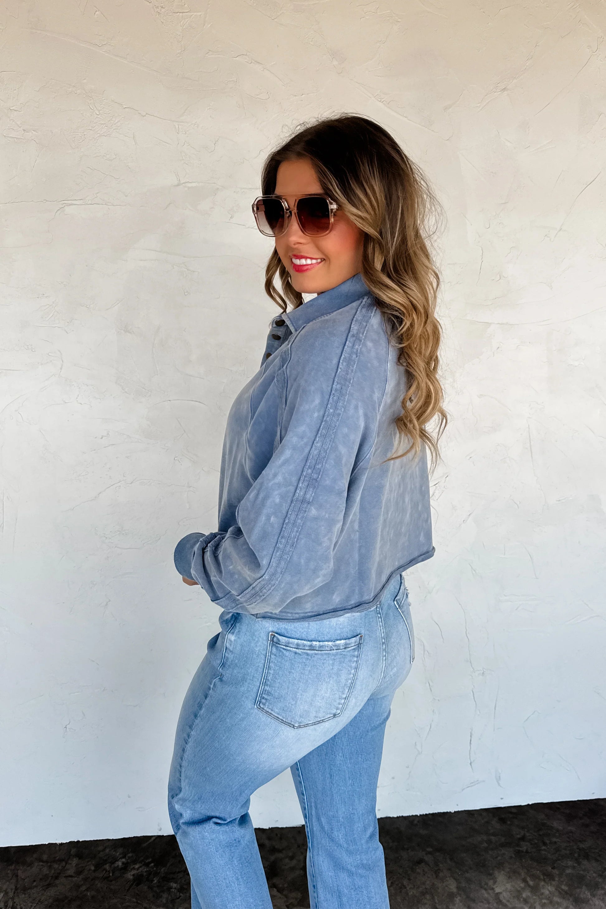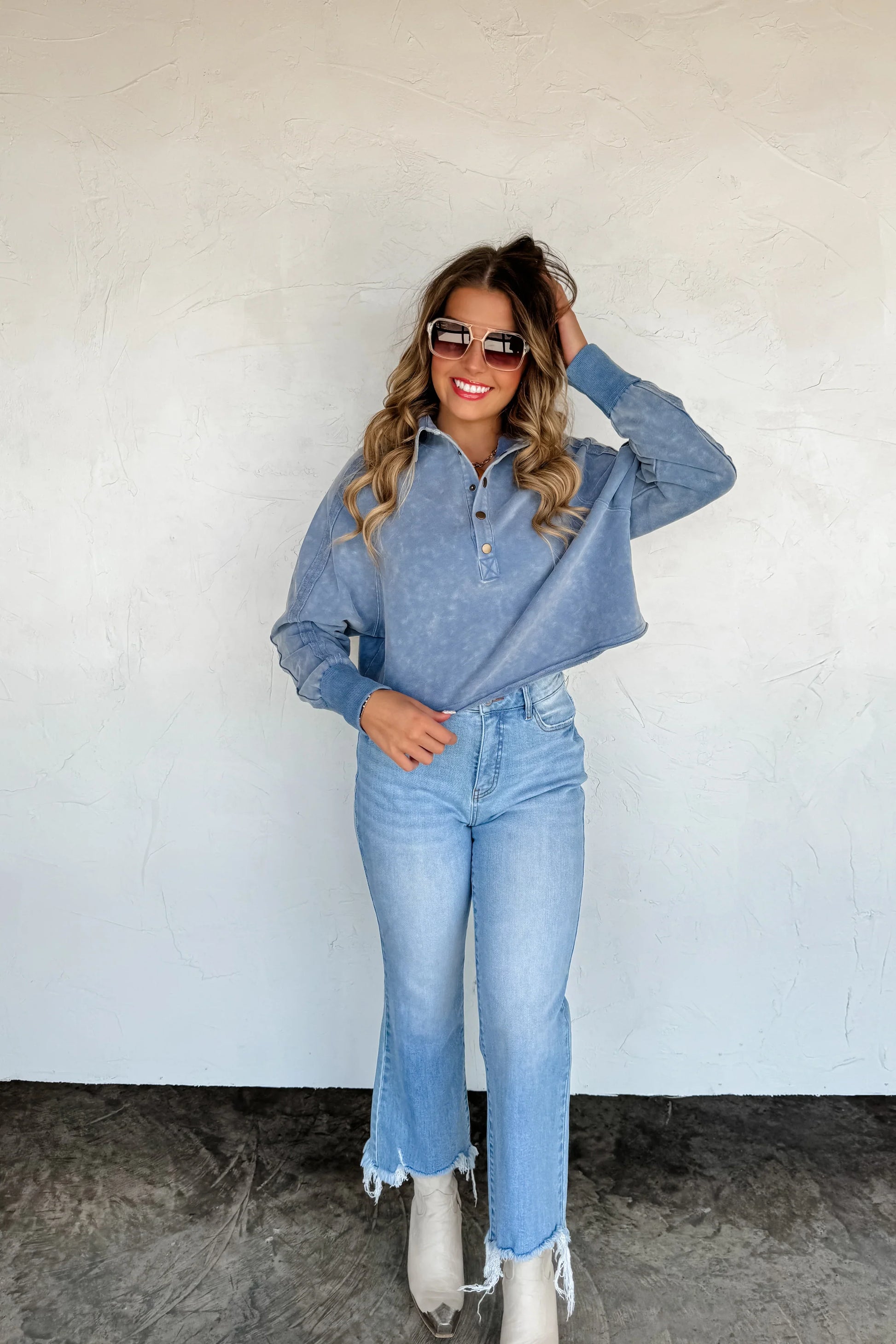 We spared no attention to detail in this raw hem/semi crop pullover! Such a relaxed, trendy look! Has a slouchy fit, vintage wash, exposed seaming and ribbed cuffs. Has super soft terry "sweatshirt" feel on the inside!