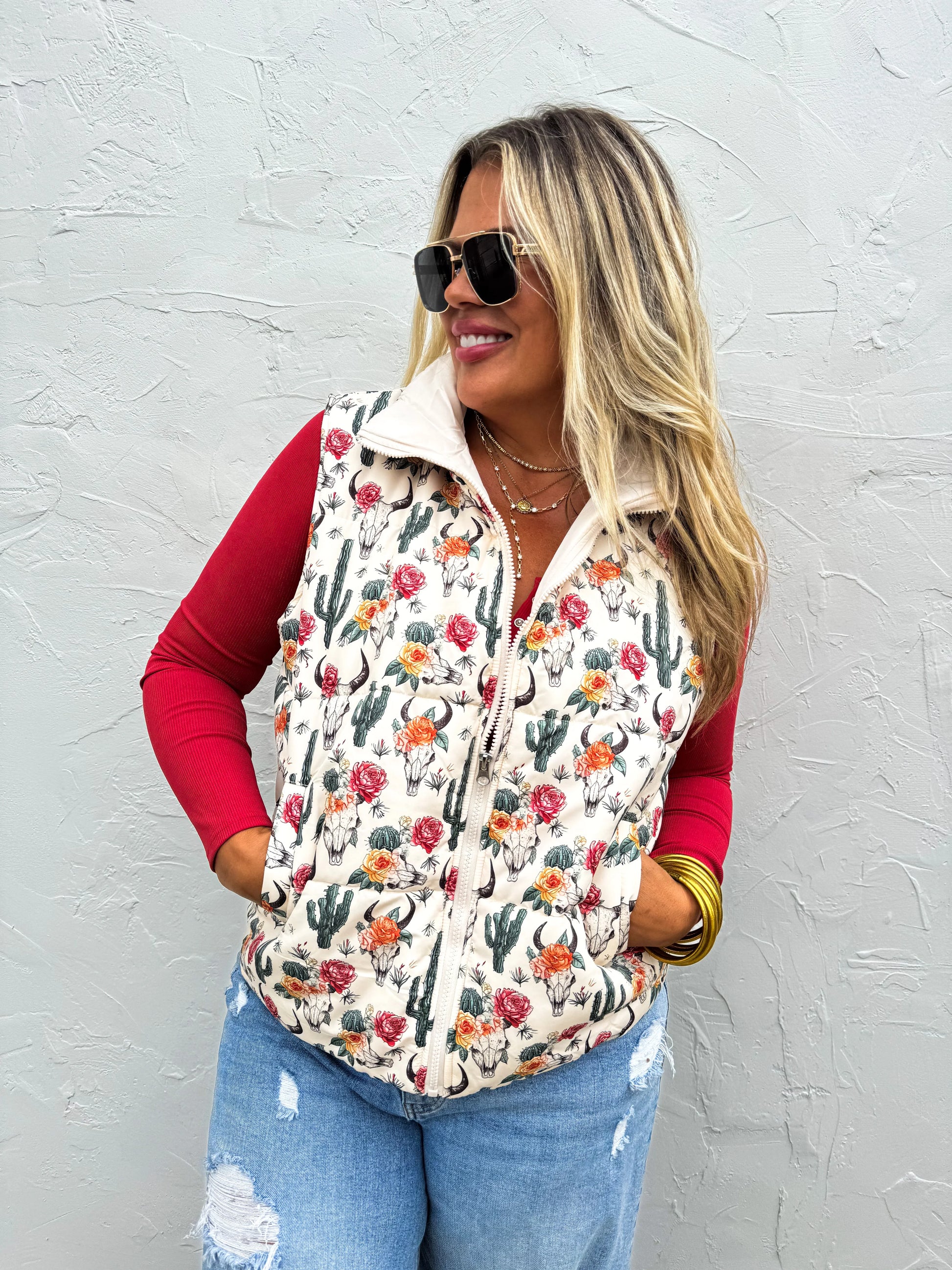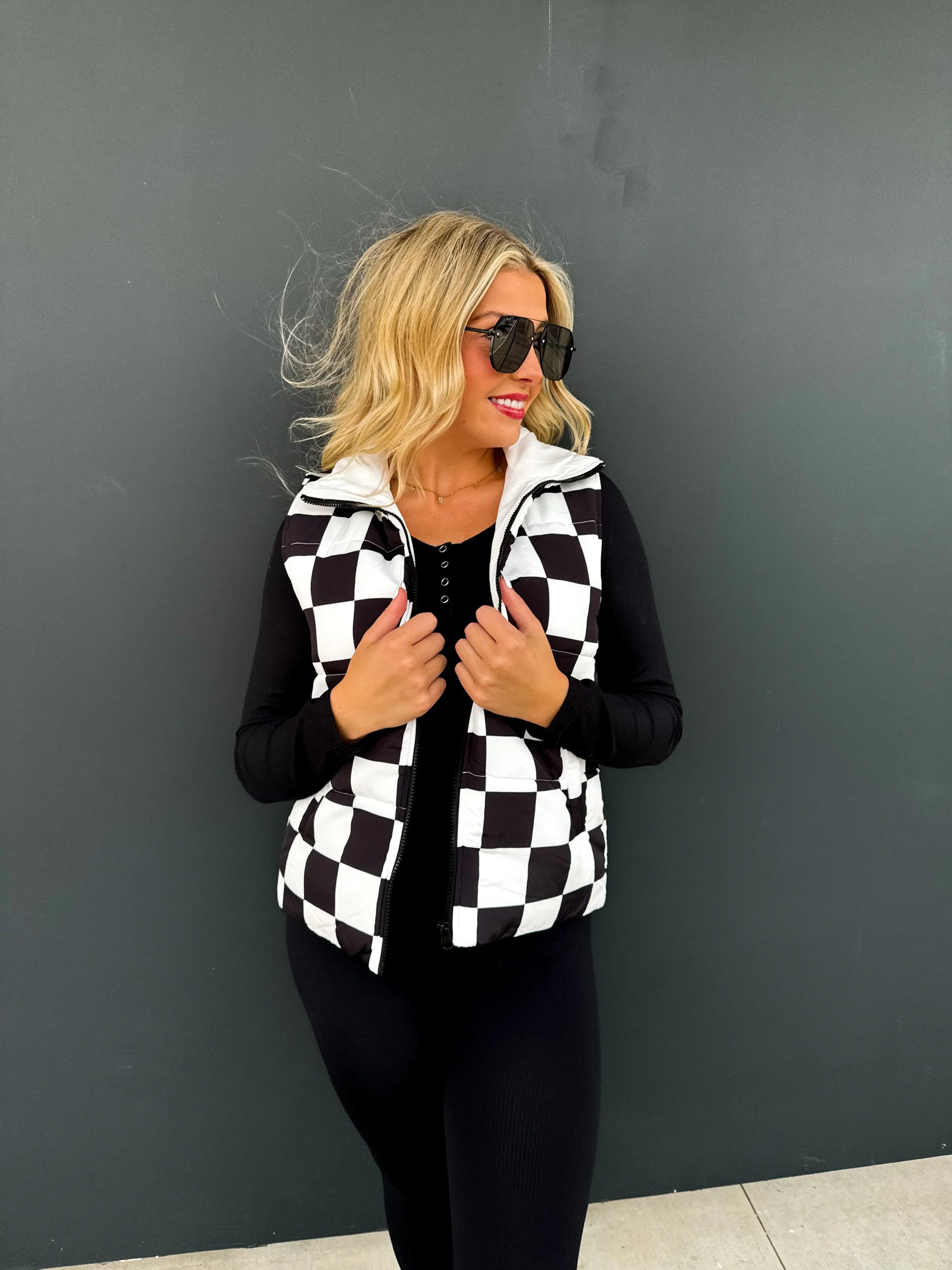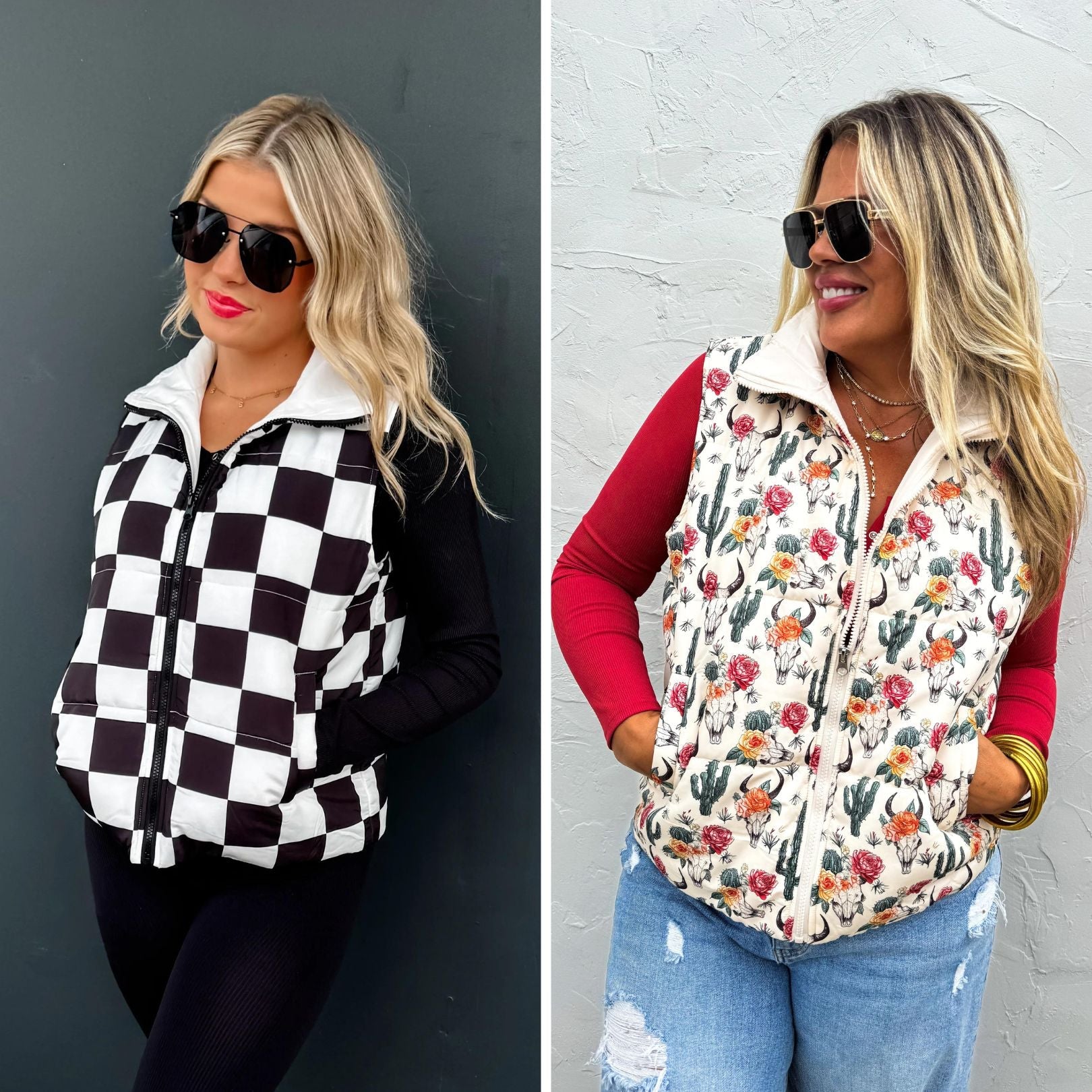 Checkers and Western are the trendiest patterns right now and this vest is your next viral sensation! This zipper puffer vest features side pockets and is oh so cute!