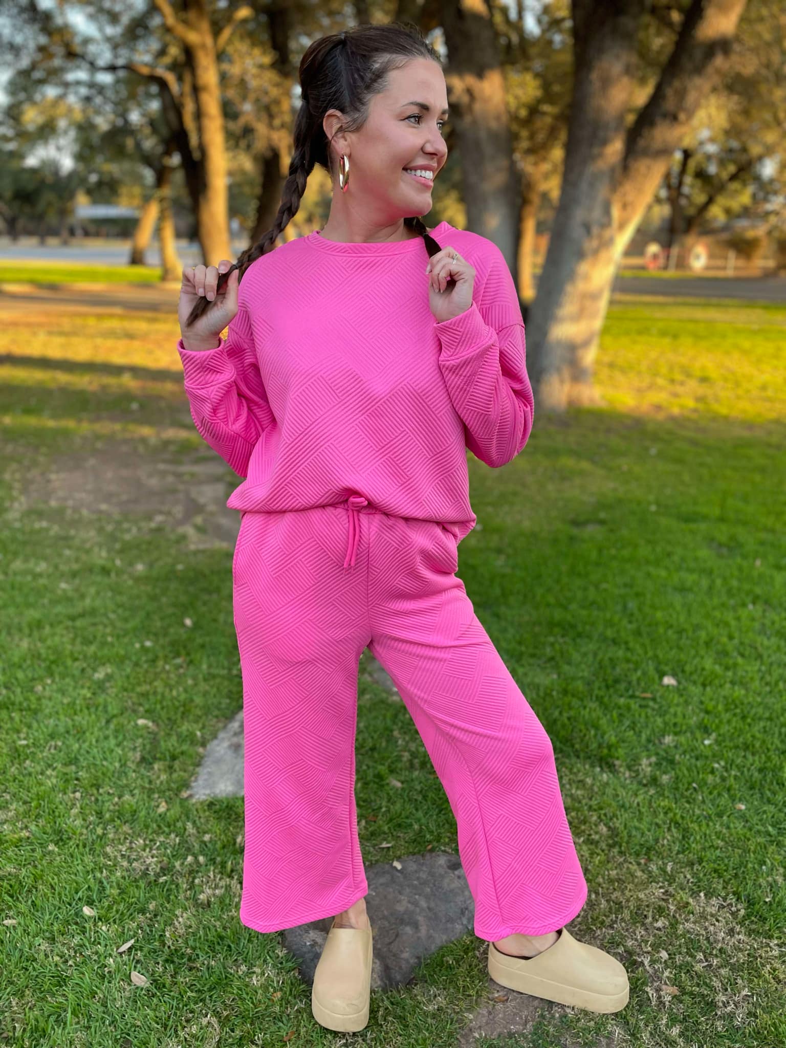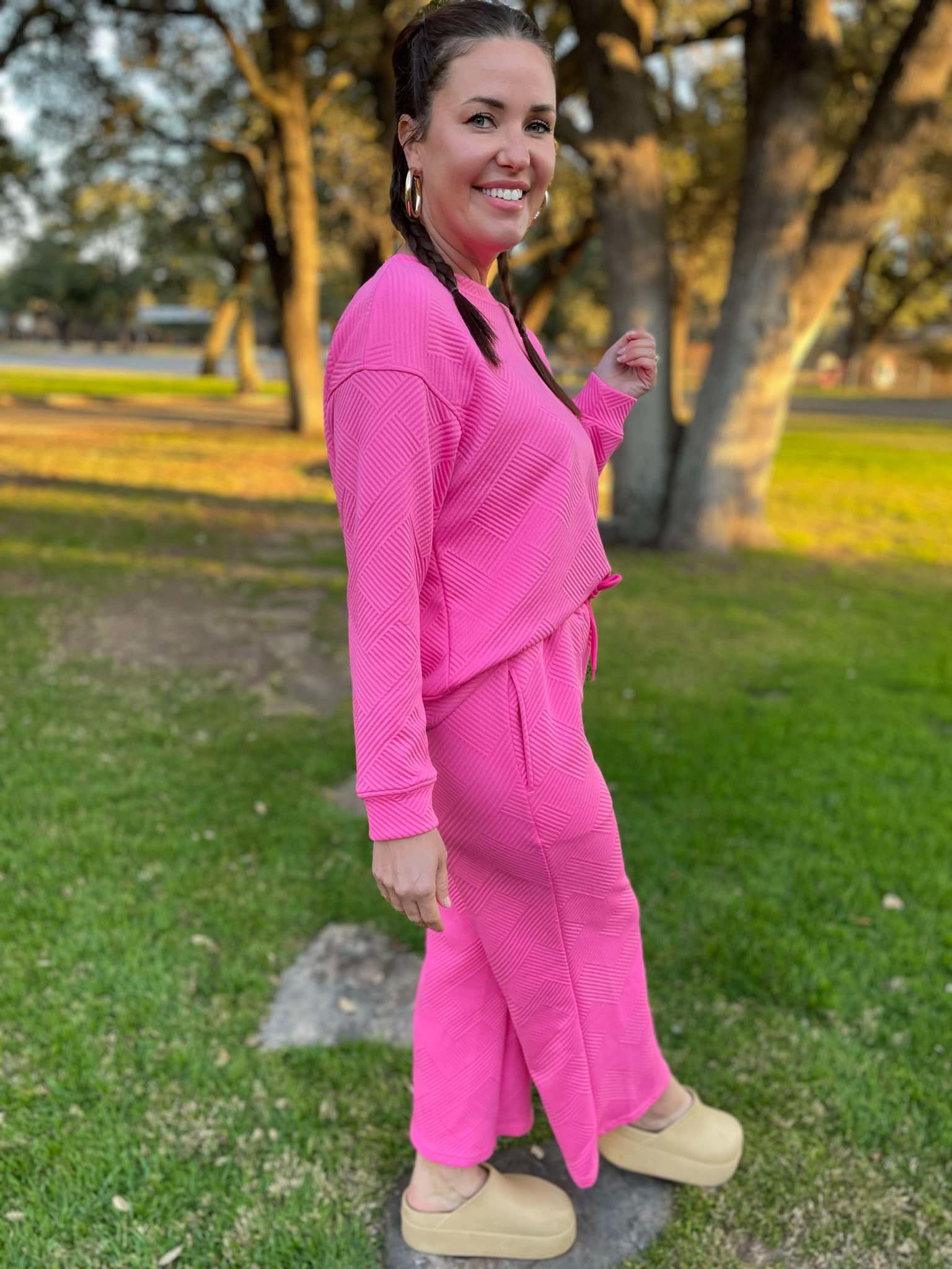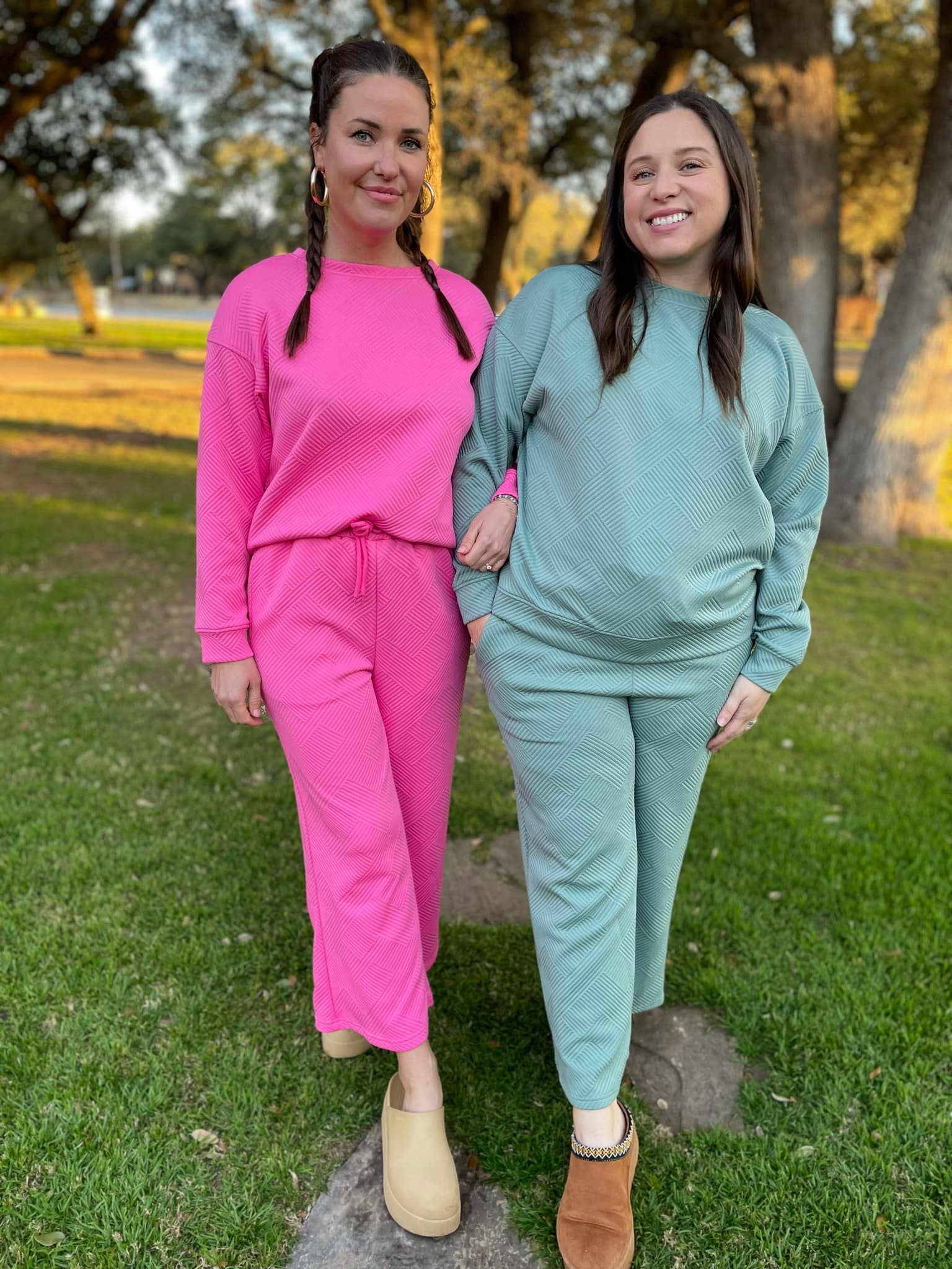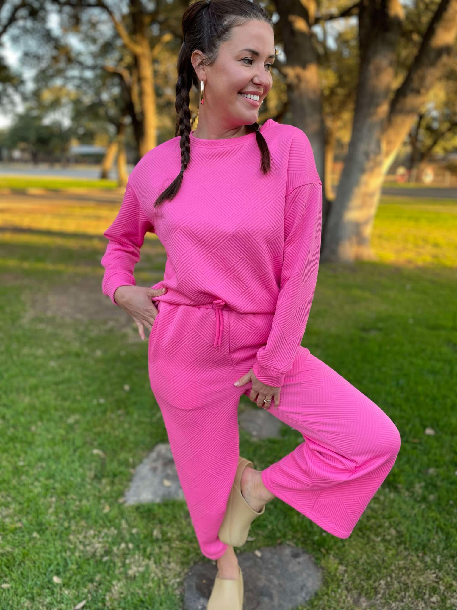 Comfort and function collide in this slouchy fit lounge set. Featuring a textured print, elastic waist and pockets. Available in three colors!