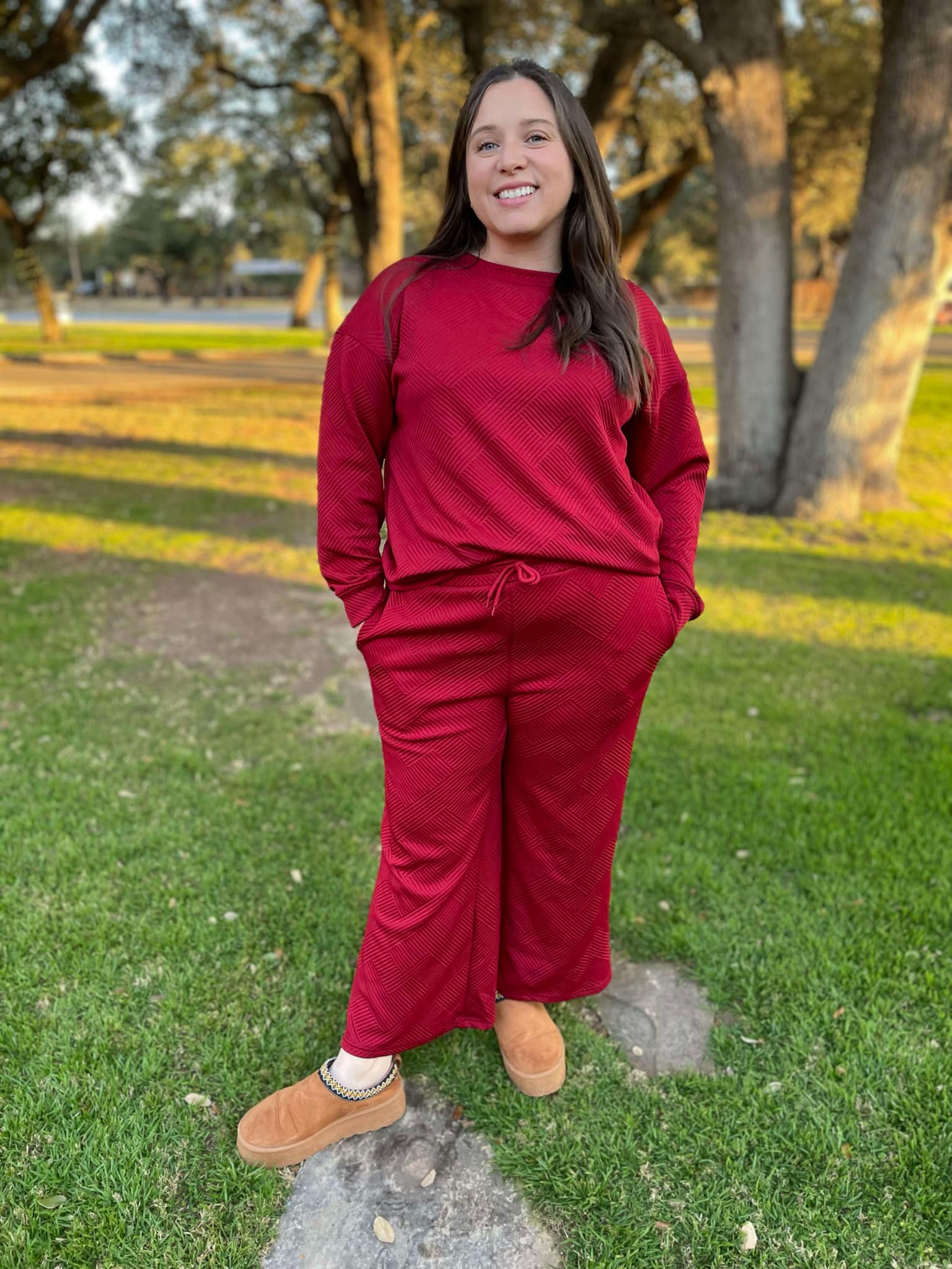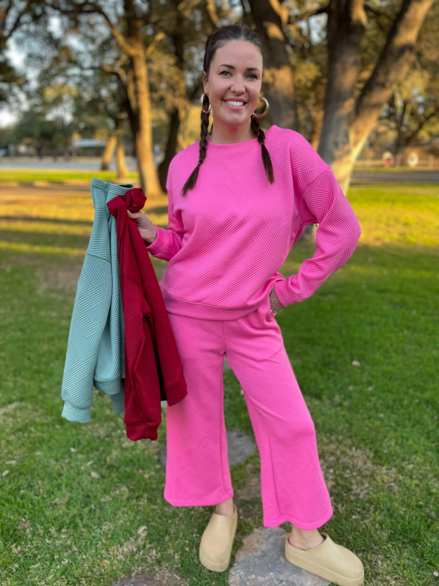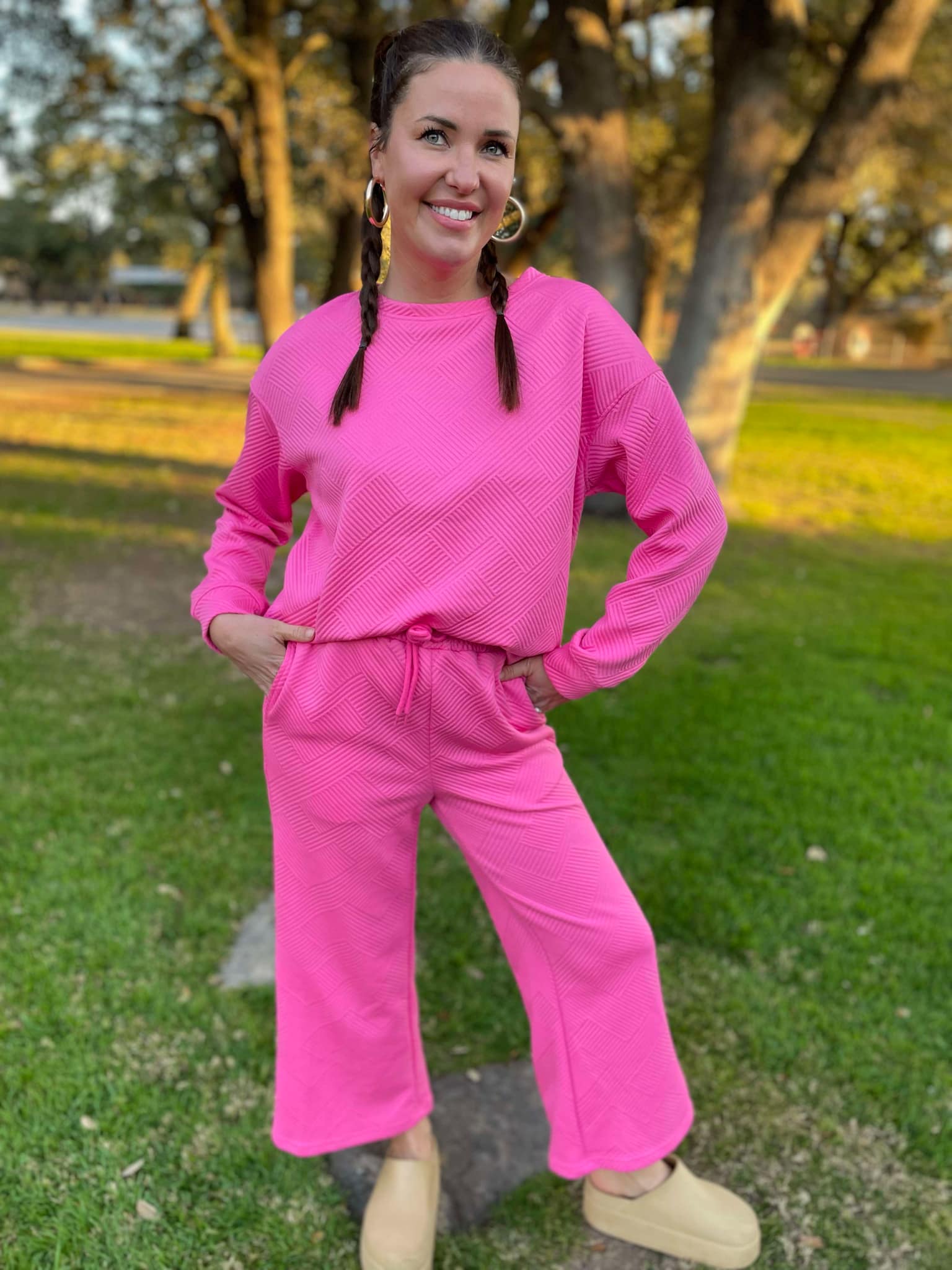 Comfort and function collide in this slouchy fit lounge set. Featuring a textured print, elastic waist and pockets. Available in three colors!