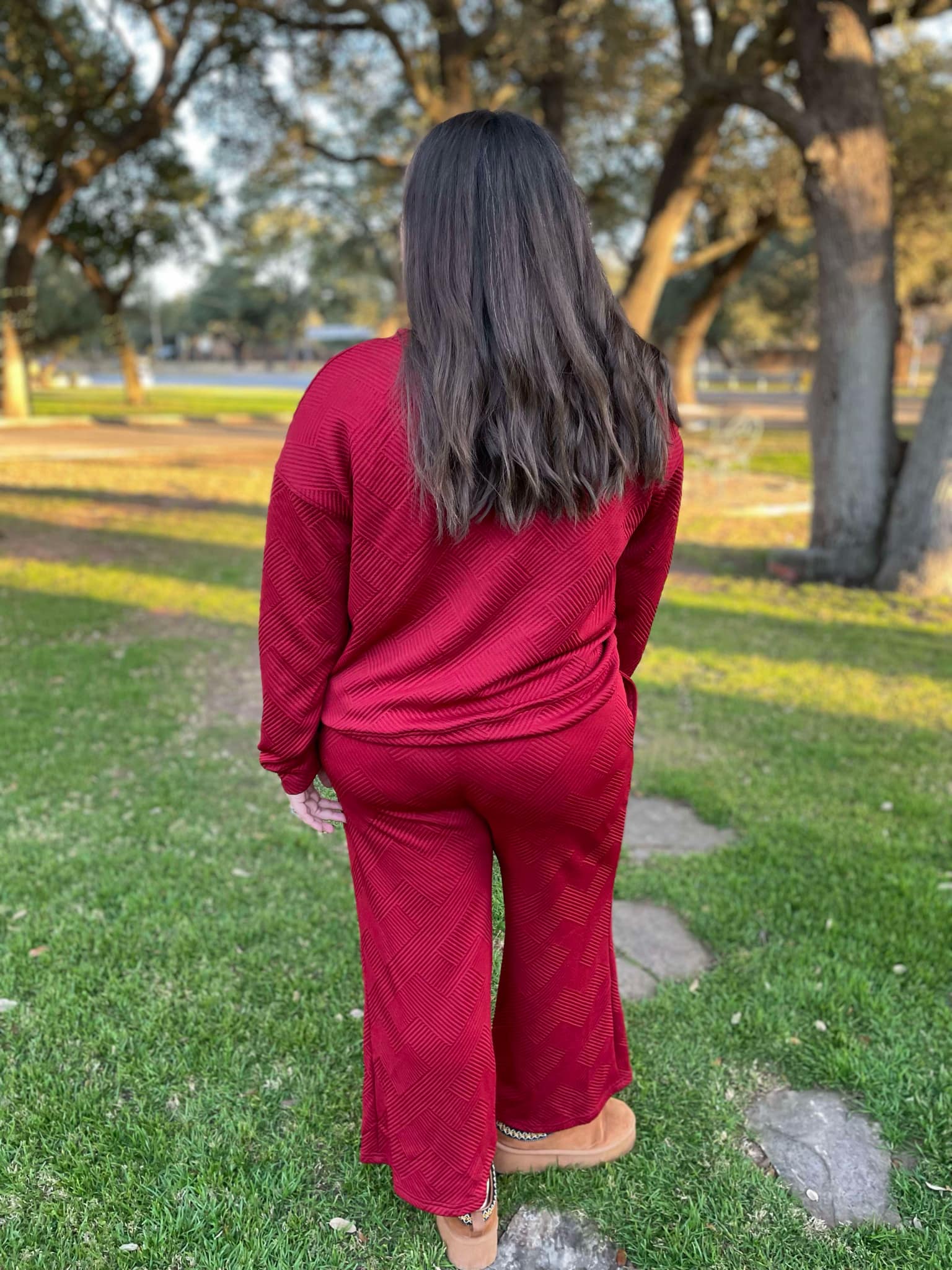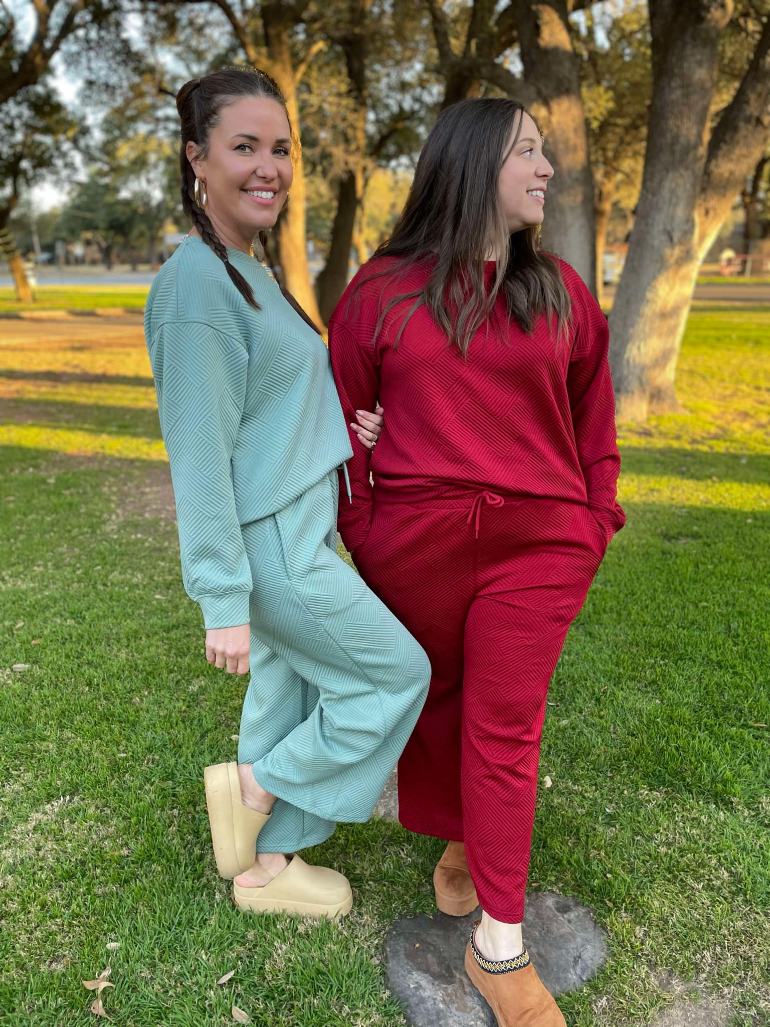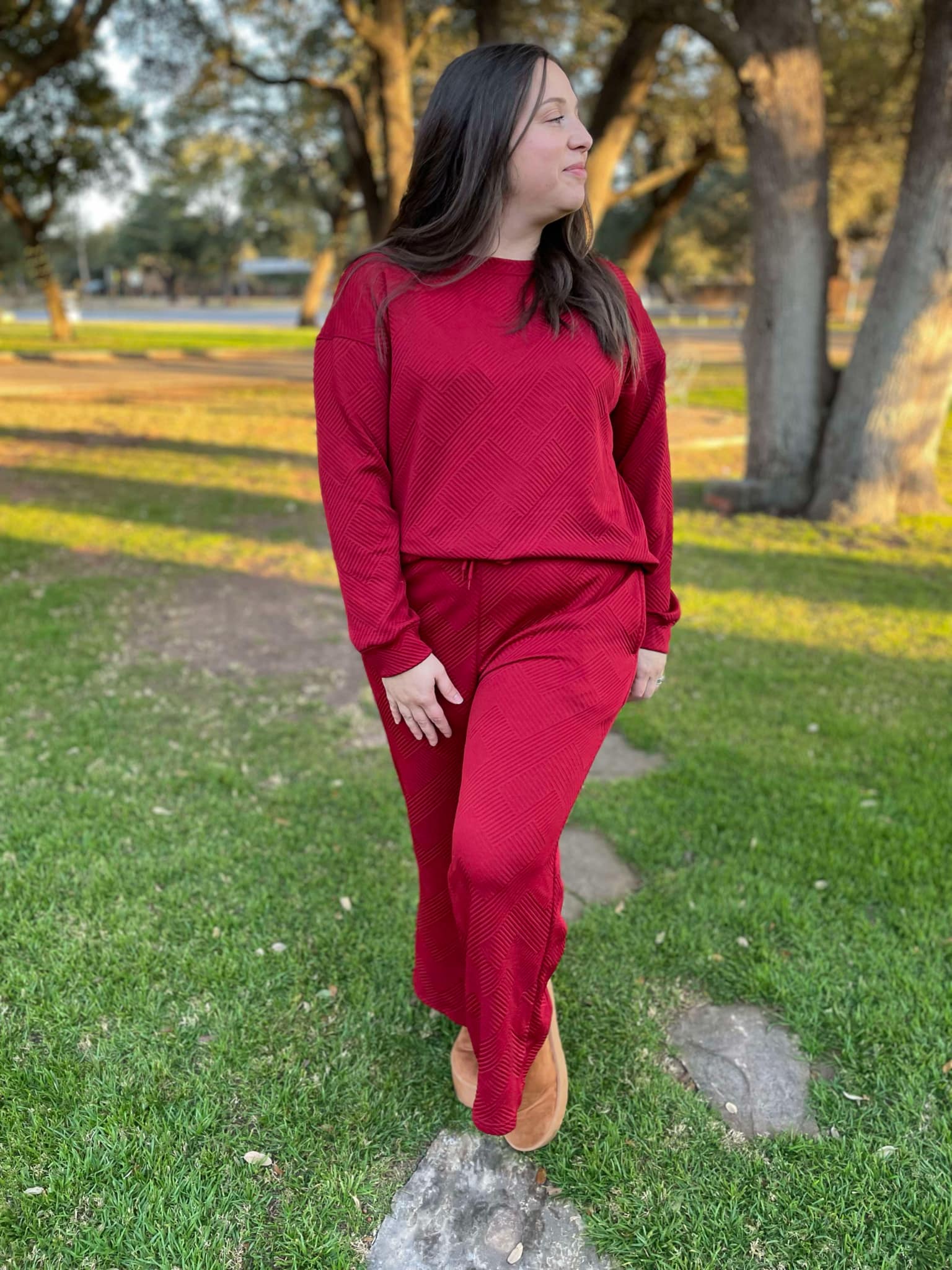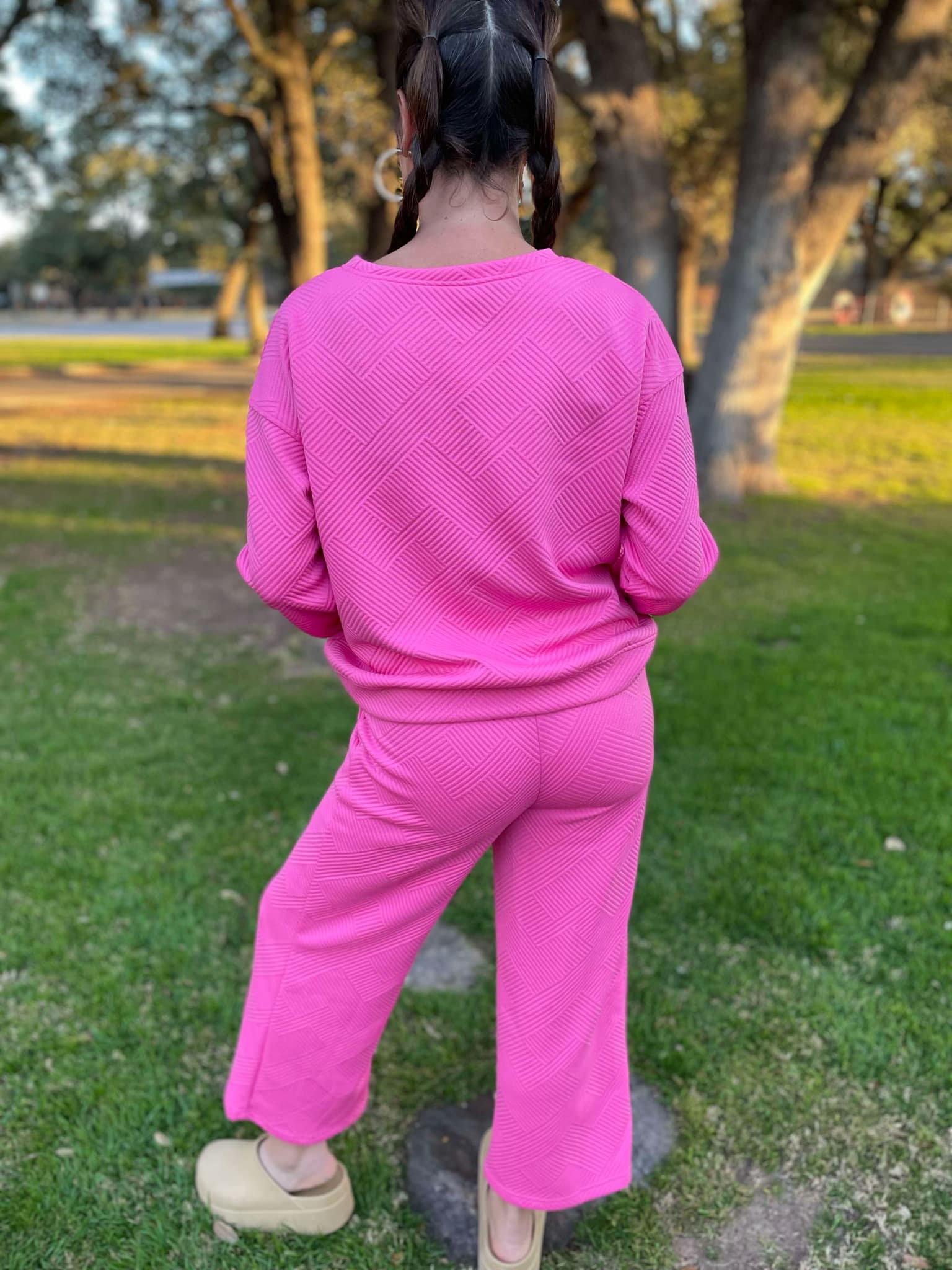 Comfort and function collide in this slouchy fit lounge set. Featuring a textured print, elastic waist and pockets. Available in three colors!