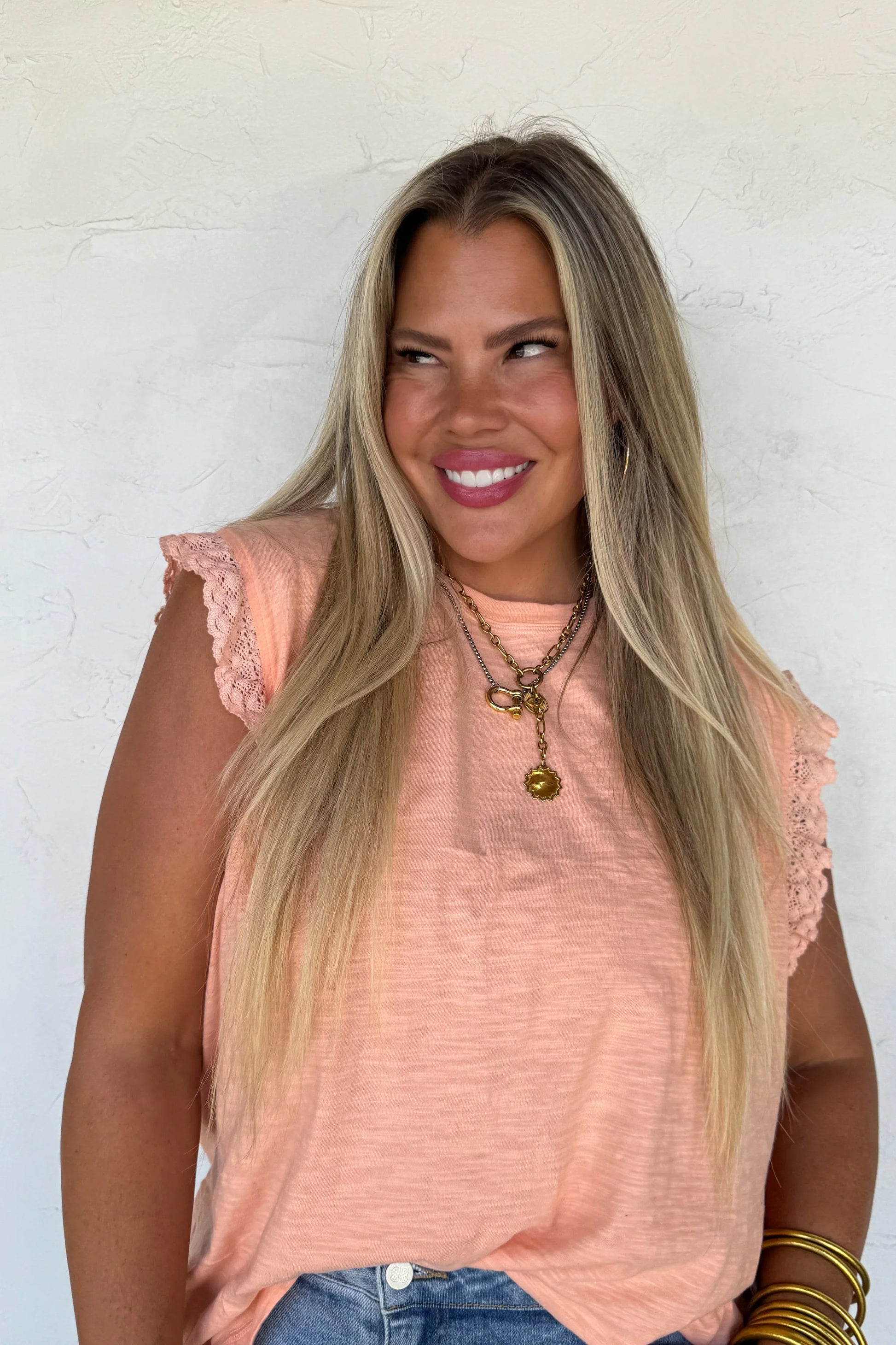 This top features a soft, slub knit fabric with fluttery lace-trimmed sleeves that add the perfect touch of sweetness.