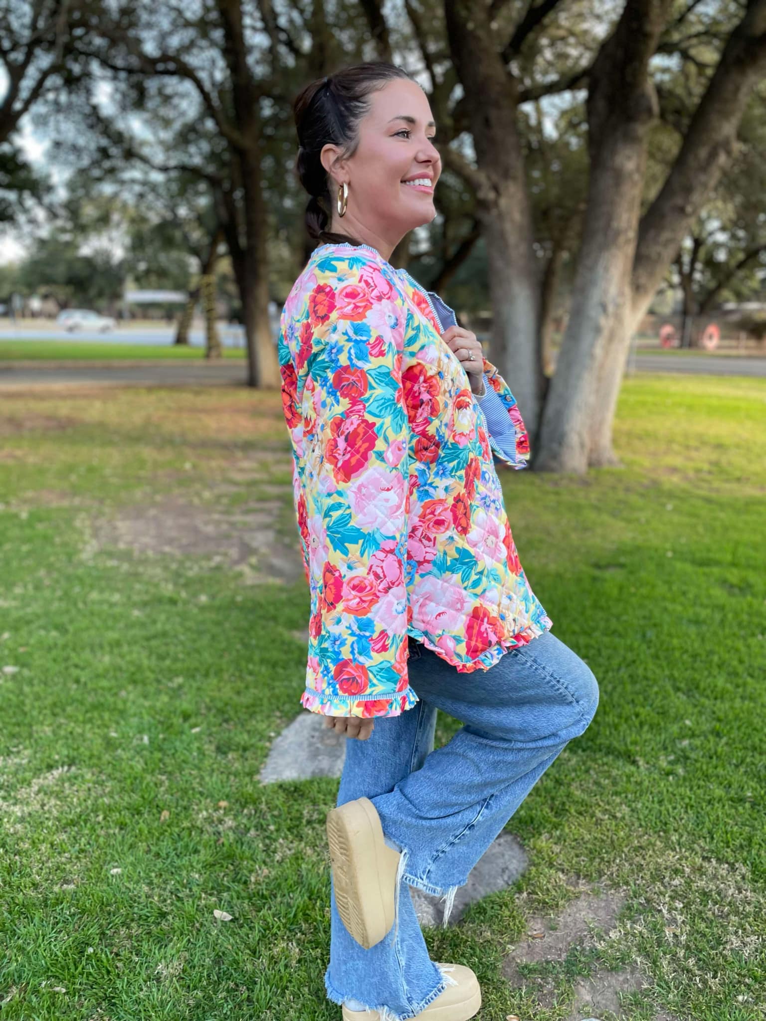 This floral quilted jacket is a showstopper! Featuring a striped lining, contrasting striped trim, ruffle detailing on the cuffs and hem with a functional button up front.
