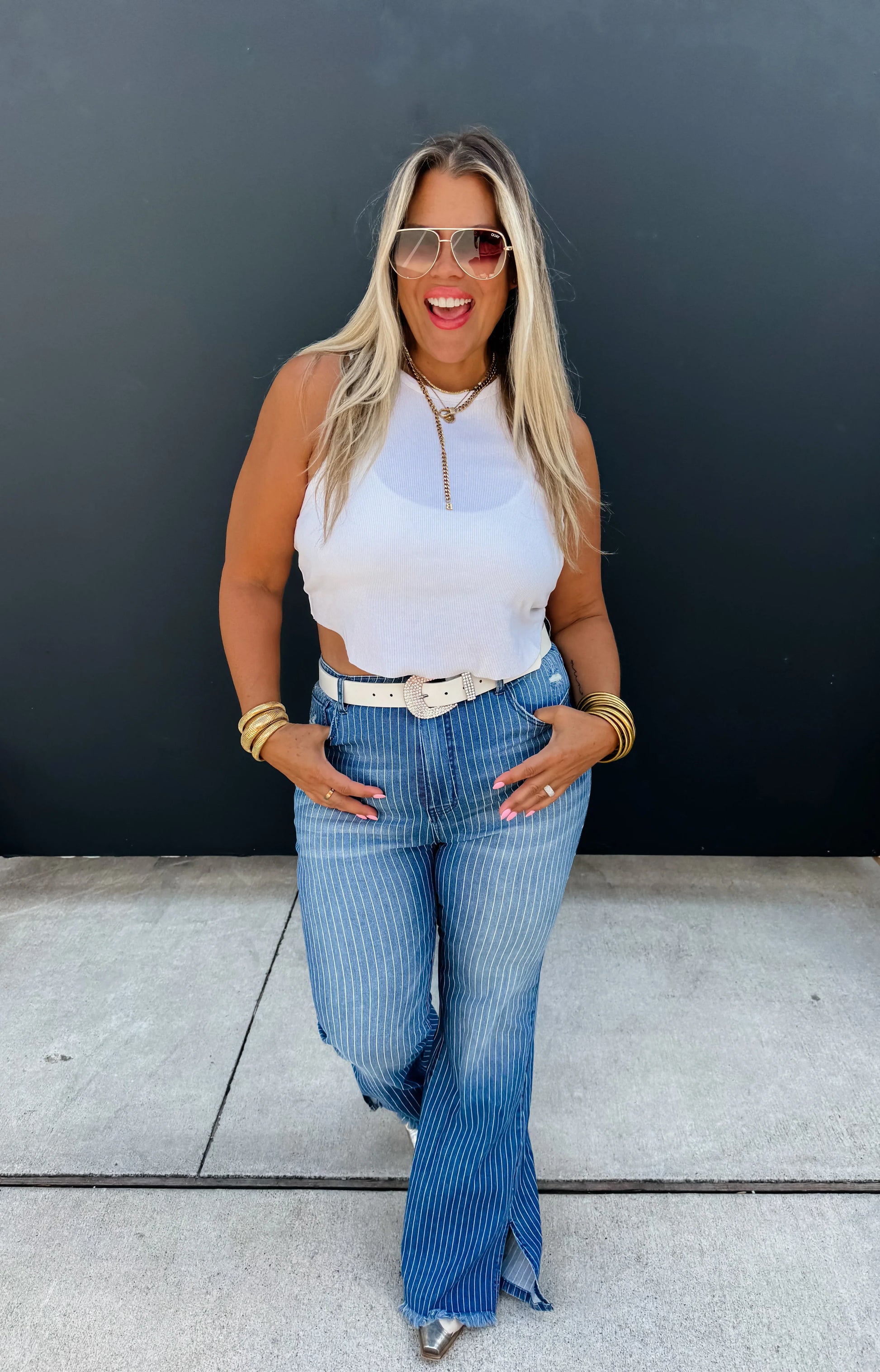 THREE WORDS! TUMMY. CONTROL.PANNEL. We are SO excited to not only launch these stretchy, light distressed flares, BUT, having a tummy control panel is a game changer with a NEW DESIGN! The medium wash features a unique slit at the bottom and tasteful distressing on the back pocket and front.
