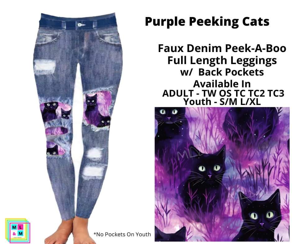 Purple Peeking Cats Faux Denim Full Length Peekaboo Leggings