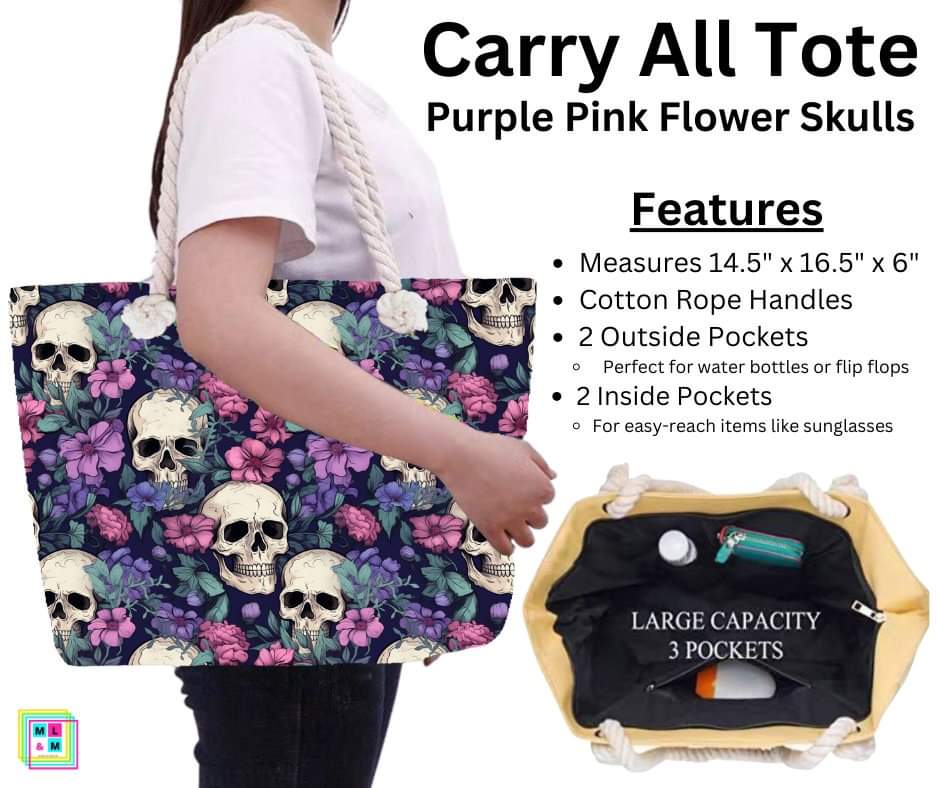 Purple Pink Flower Skulls Carry All Tote w/ Zipper