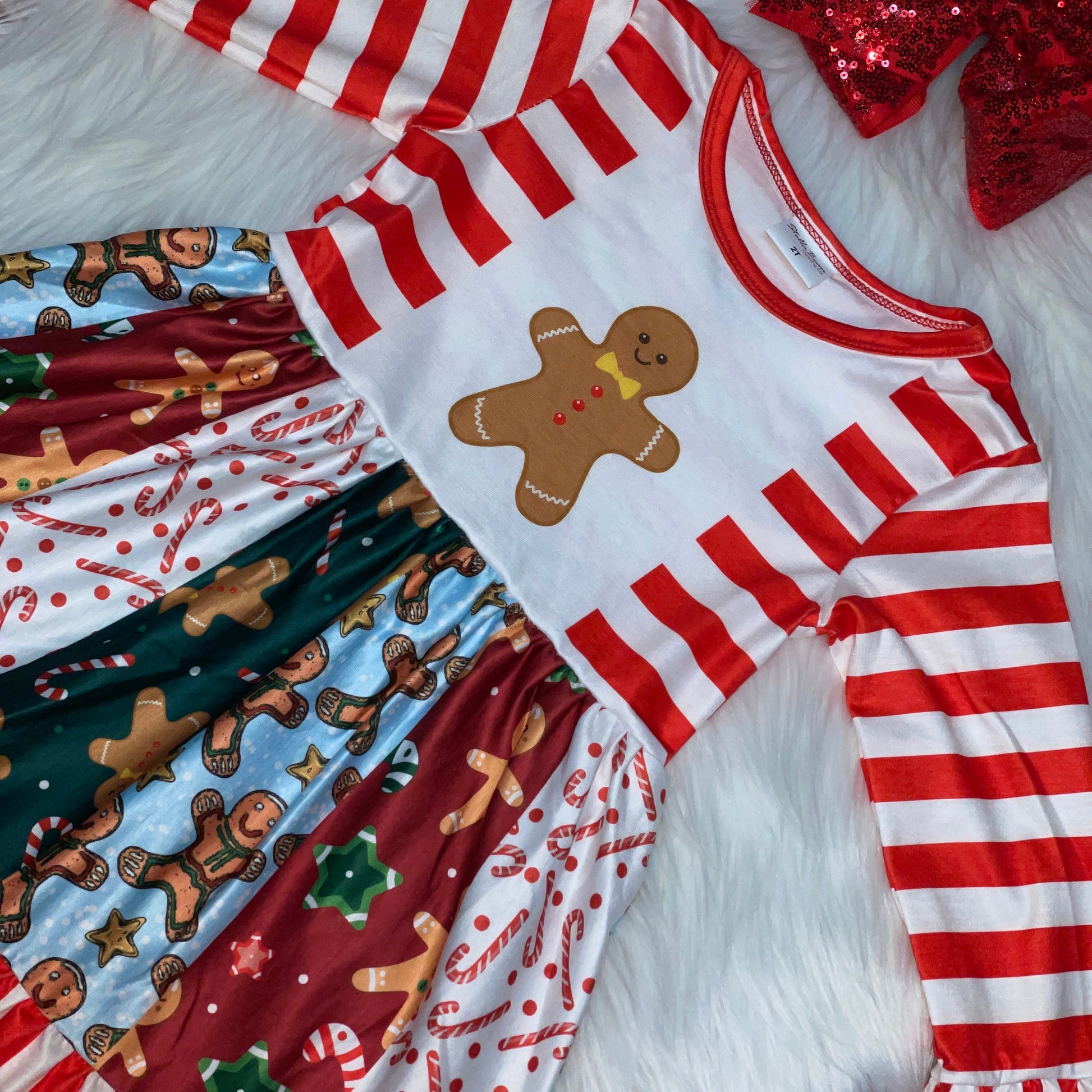 Red & White Gingerbread Cookie Panel Long Sleeve Dress