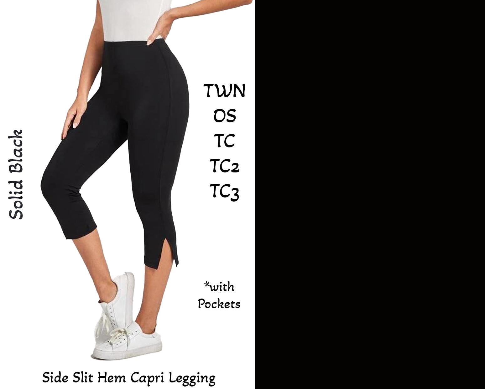 Solid Black Side Slit Hem Capri Leggings with Pockets