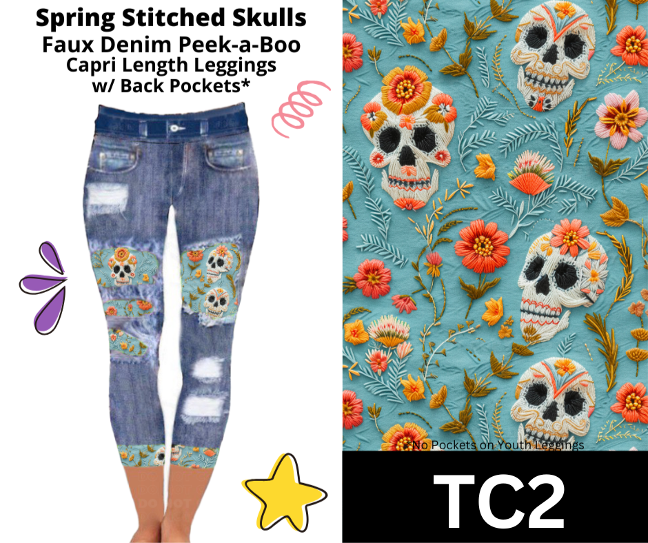 Spring Stitched Skulls Capri Faux Denim Peekaboo