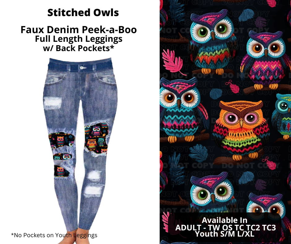 Stitched Owls Faux Denim Full Length Peekaboo Leggings