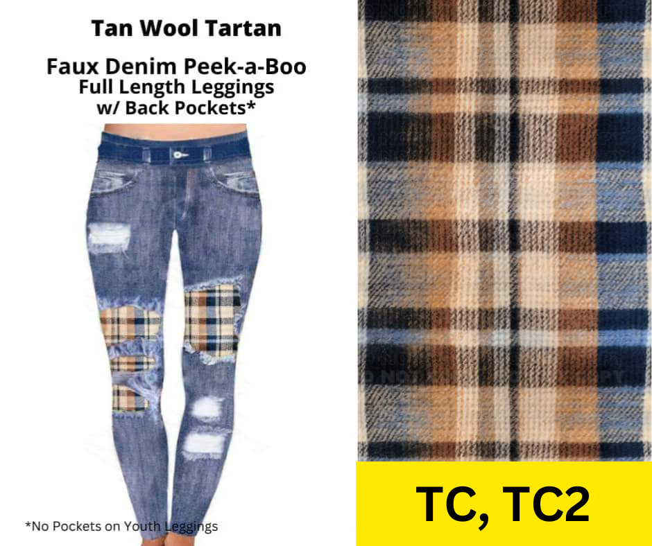 Tan Wool Tartan Faux Denim Full Length Peekaboo Leggings