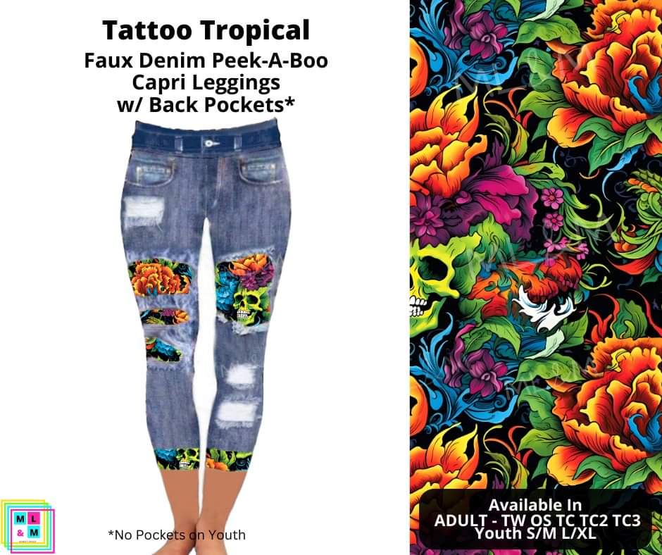 Tattoo Tropical Faux Denim Peekaboo Capris